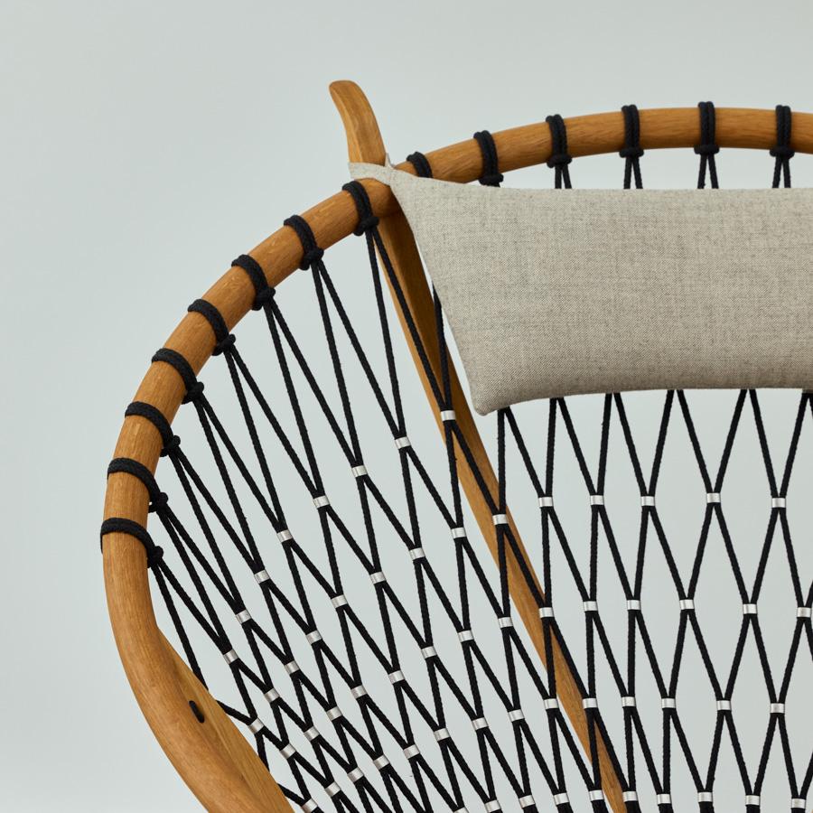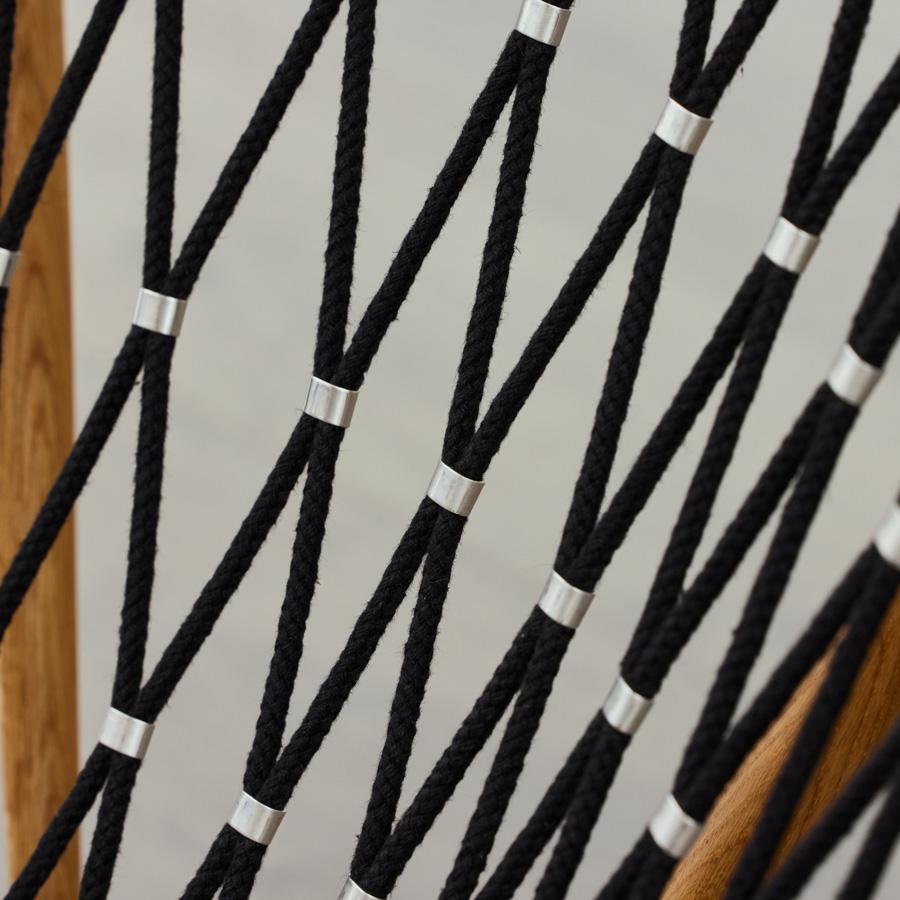 背もたれと座面には、フラッグハリアード(強靭な麻のロープ)が編み込まれており、見た目のインパクトとは裏腹に、身体を預けると適度にしなり、まるで宙に浮いているかのような心地よさを提供します。