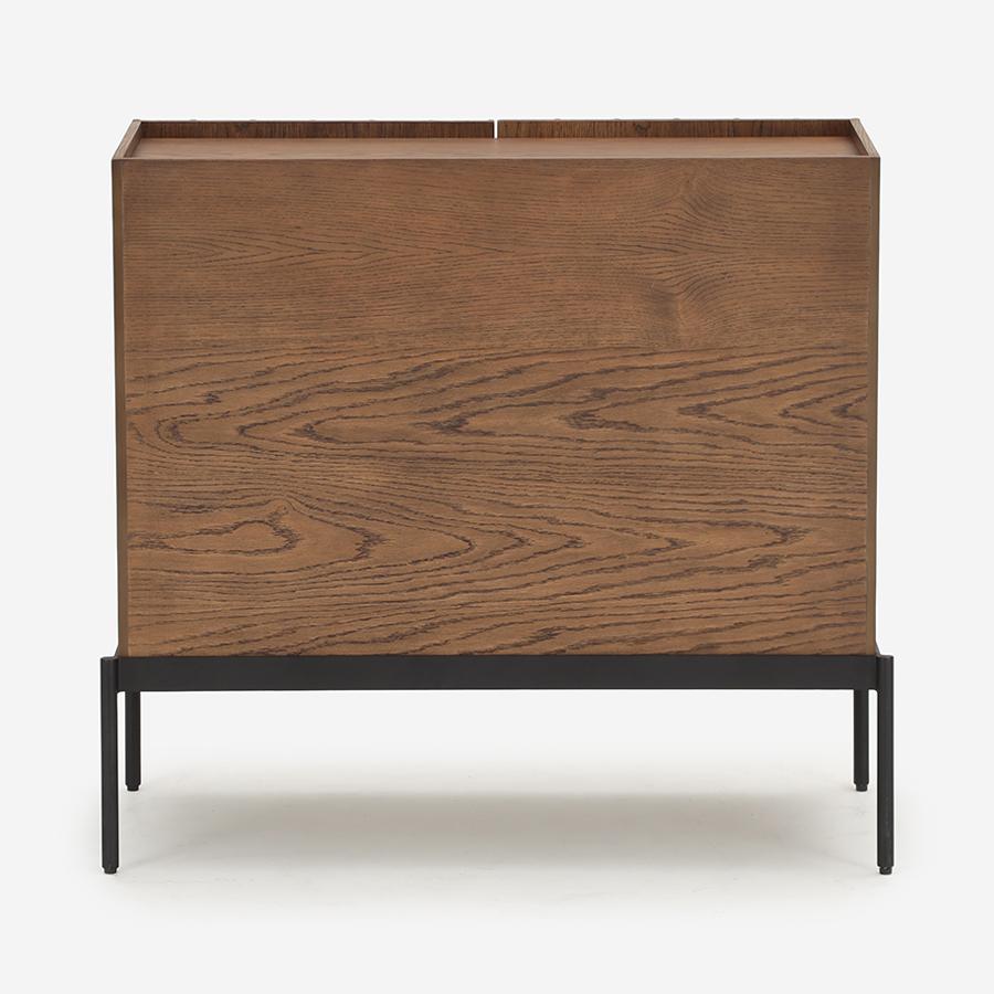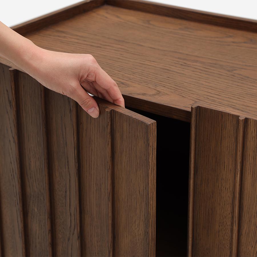 トレイのような形状に仕上げられた天面部分は、縁(ふち)がそのまま取っ手として利用できるスマートなデザインが特徴です。すっきりとした建築的なディテールは、お部屋を落ち着いた雰囲気にします。