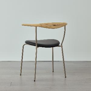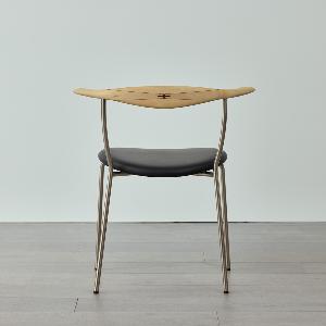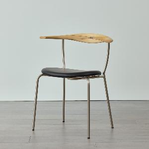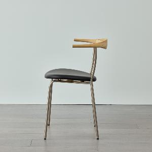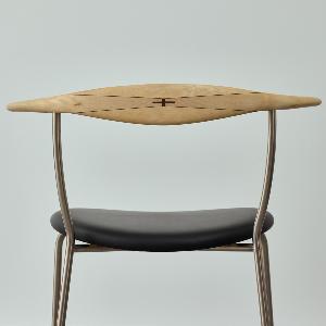 レザーの座面、スチールの脚、無垢材の背もたれで構成されたシンプルかつ印象的なデザイン。