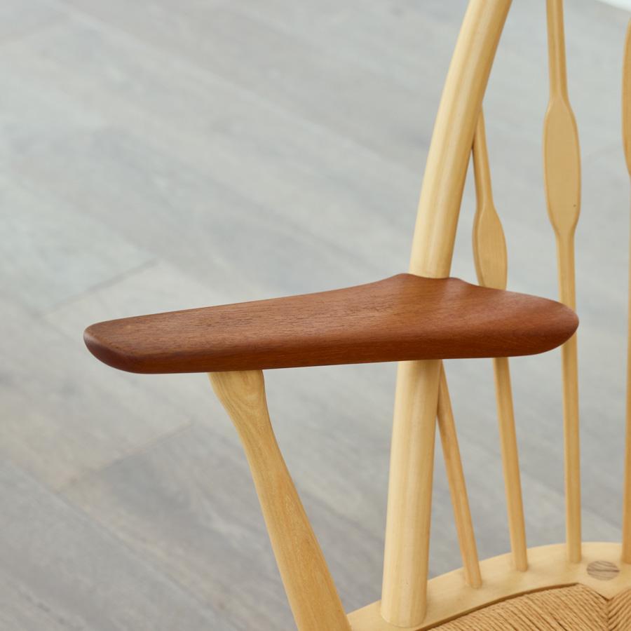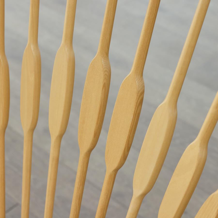 家具の枠を超えた彫刻作品のような佇まいの中にも奇抜さだけではなく、古典への深い敬意と理解が込められています。 PPモブラーの熟練した職人が、厳選された木材を削り出し、組み上げることで初めて完成する芸術的なチェアです。その最大の特徴である、扇状に広がった背もたれ。 一見すると装飾的なデザインに見えますが、実はウェグナーならではの緻密な人間工学に基づいています。