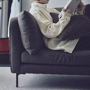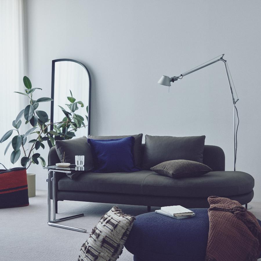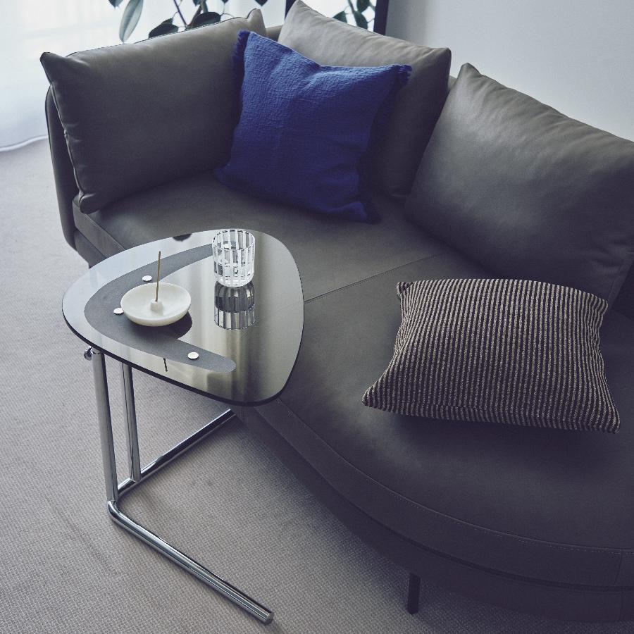 • アームや背もたれにもたれかかってリラックスしたり、サイドテーブルを使って食事や仕事をしたりできます。張地:F-9089 脚:ブラック 幅188cm 左側アーム