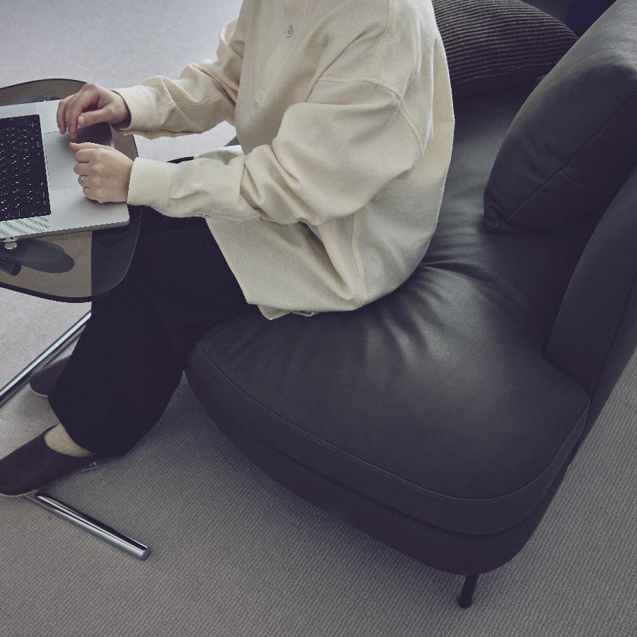 座面クッションが分割されていない「ワンシート構造」のため、洗練されたデザインでありながら、二人で座っても中央の溝による不快感がなく、座る場所に制約がありません。ウレタンをシート全体に均一に配置しているので、どこに座っても安定した心地よさで身体を支えます。
