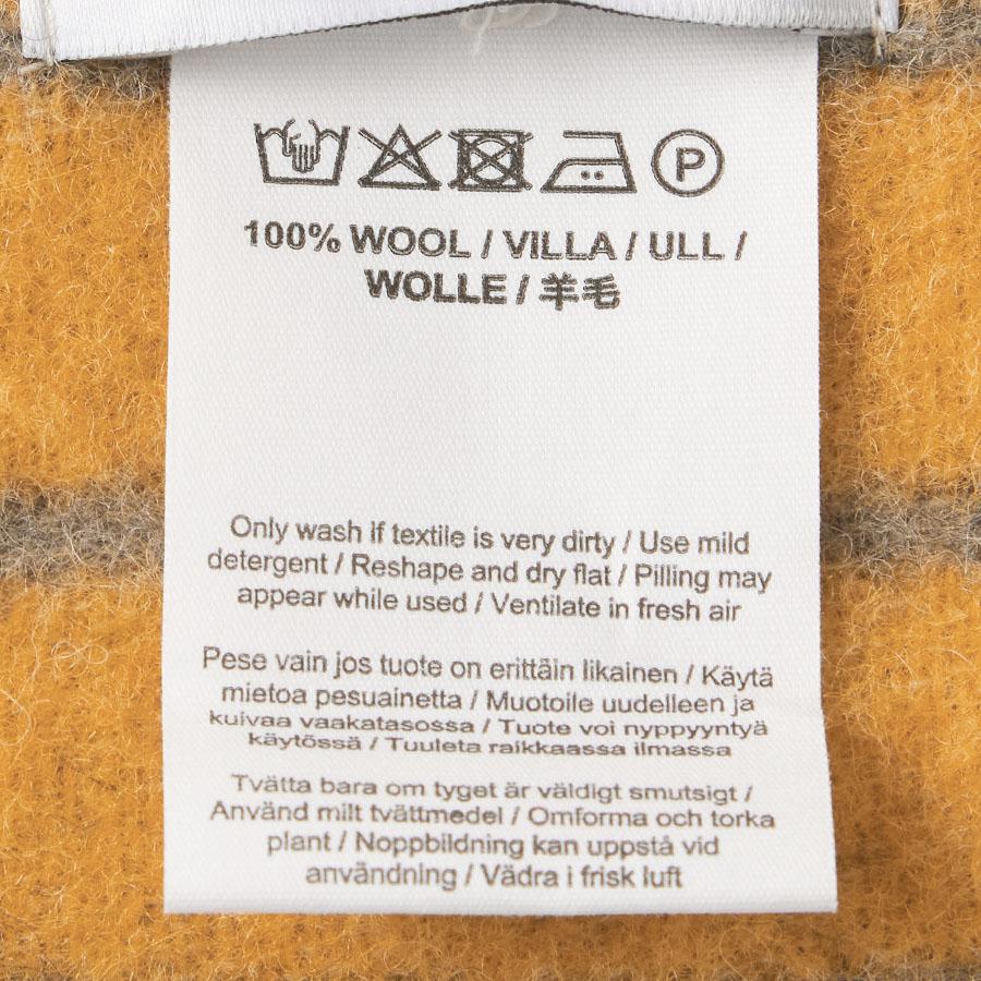 テキスタイルが非常に汚れている場合のみ洗濯してください。それ以外の場合は、新鮮な空気の中でしばらく外に出して風を通してください。手洗いは最大30°Cで、またはドライクリーニングを行ってください。粉末洗剤を使用する場合は、十分な水に溶かしてください。ブランケットを水に浸し、すぐに洗います。軽く押し洗いし、こすったり、引っ張ったり、強く絞ったりしないでください。十分にすすぎ、水分を軽く絞ります。タオルで挟んで半乾きにし、風通しの良い場所で自然乾燥させてください。タンブル乾燥は避けてください。アイロンは湿らせた布を当て、最大150°Cで行ってください。
