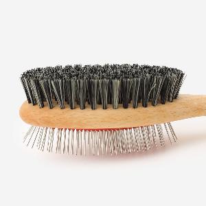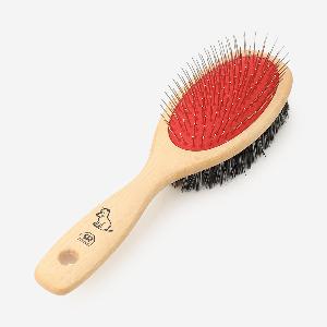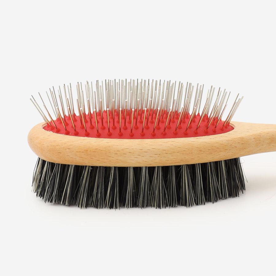毛質が硬めの犬種におすすめ。クッションがついたメタルピンは絡まったり毛の長い部分に。豚毛とタンピコの面を使うと血行を促しながら艶のある毛並みに。