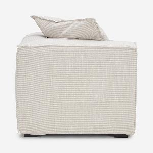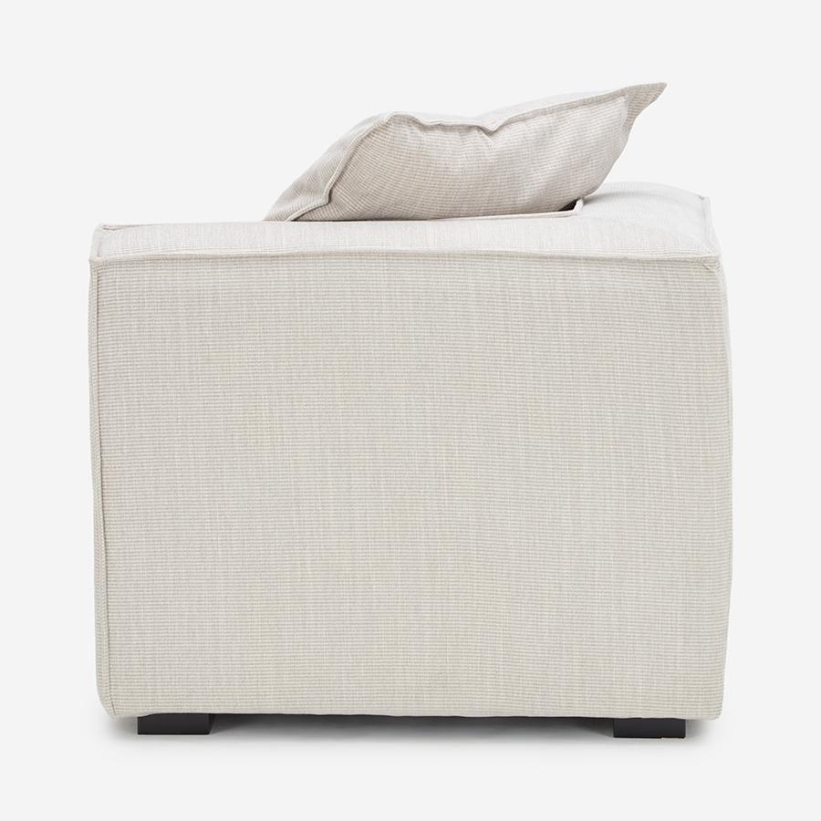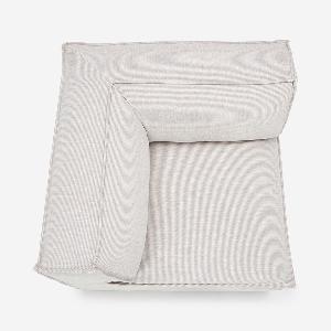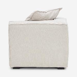 1人掛けは、幅と奥行きが約92㎝とコンパクトで、アームレスなので横からも座りやすく、写真のような窓下のちょっとしたスペースにも置くことができます。1人掛けですが、あぐらをかいたり、横を向いて座ることができ、70cm角の大きなクッションがセットになっていますので、背中に挟んで姿勢をサポートしたり、読書やスマホを見るときには、膝にのせて肘置きとして活躍します。また、ふっくらとした個性的なシルエットと、ルーズ感のある張地は、緊張感を和らげてくれます。