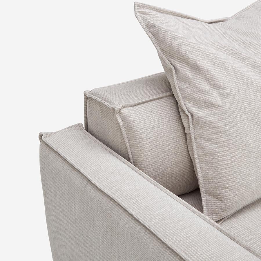ビッグシルエットのボリュームですが、すっきりとした直線が美しいソファです。ラフ過ぎない雰囲気なので、お部屋にきちんと感を出したい人にもおすすめです。座り心地は、ぜひ動画をご覧ください。最初はもっちりした感触で、そこからフワッと包み込まれるような包容力があり、体重をかけると、ほどよい弾力で体を支えてくれます。体が沈み込みすぎませんから、立ち上がりも簡単。また、アームがないので、座面の幅を最大限に使えて、あぐらや横座りもラクにできます。