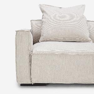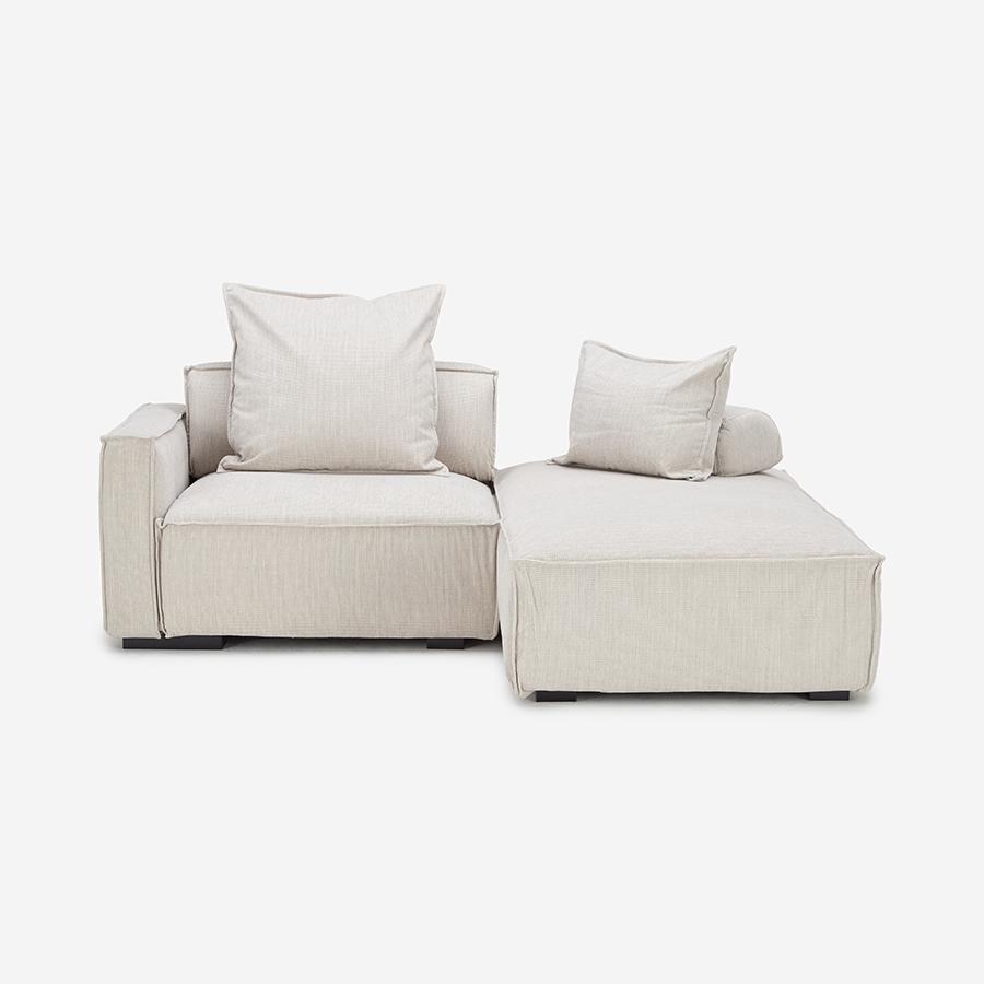 リビングでのソファの配置は、テレビや窓、壁の位置に影響を受けやすく、制限があるなかで選ぶことが多いですよね。MITONの1人掛け、2人掛けにはアームがありませんので横からも座りやすく、オットマンは背もたれもないことから、全方向からアクセスが可能。