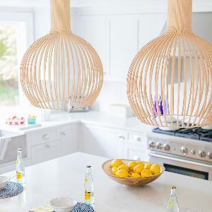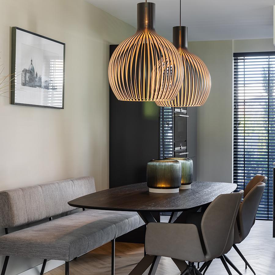 さらに、光源が直接目に入らないよう計算し尽くされたデザインにより、木の隙間から広がる柔らかな光が、ダイニングやリビングをやさしく温かい光で照らし出します。