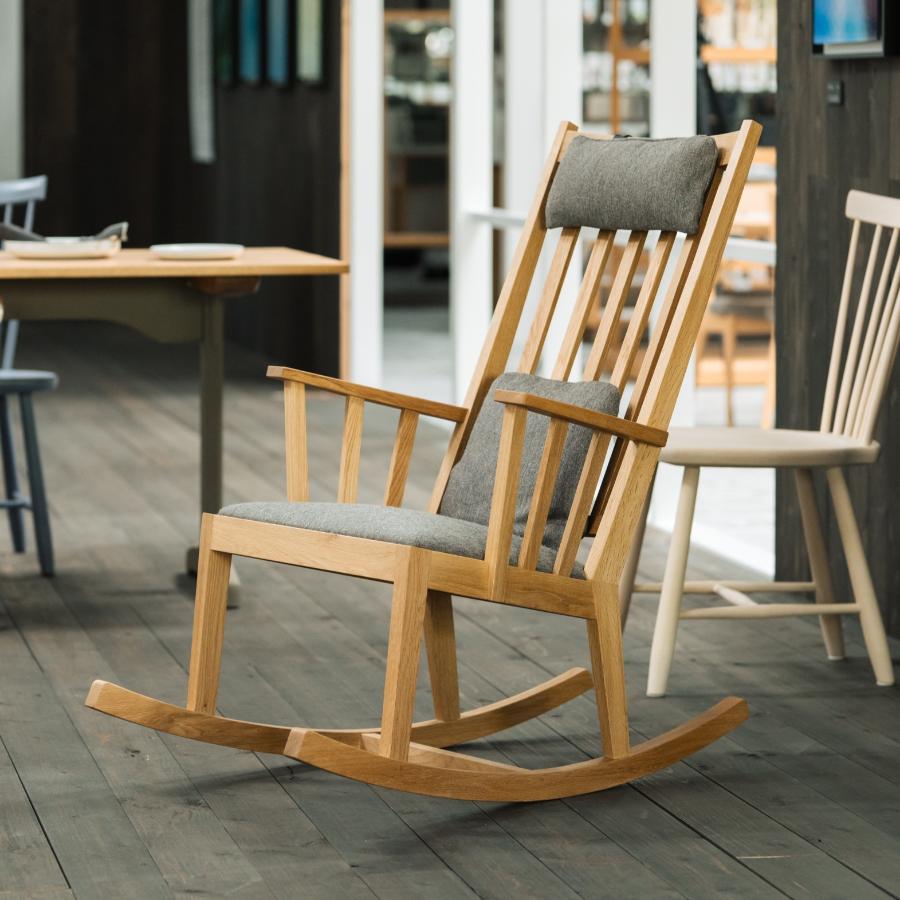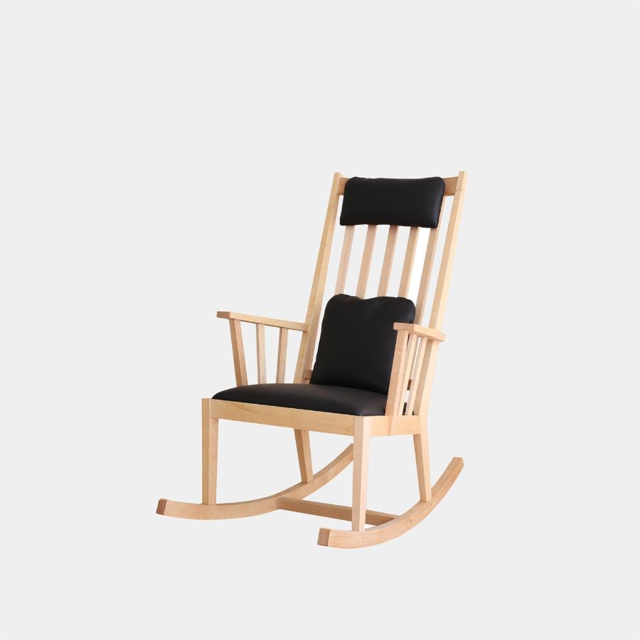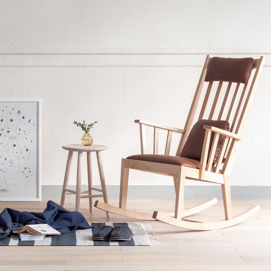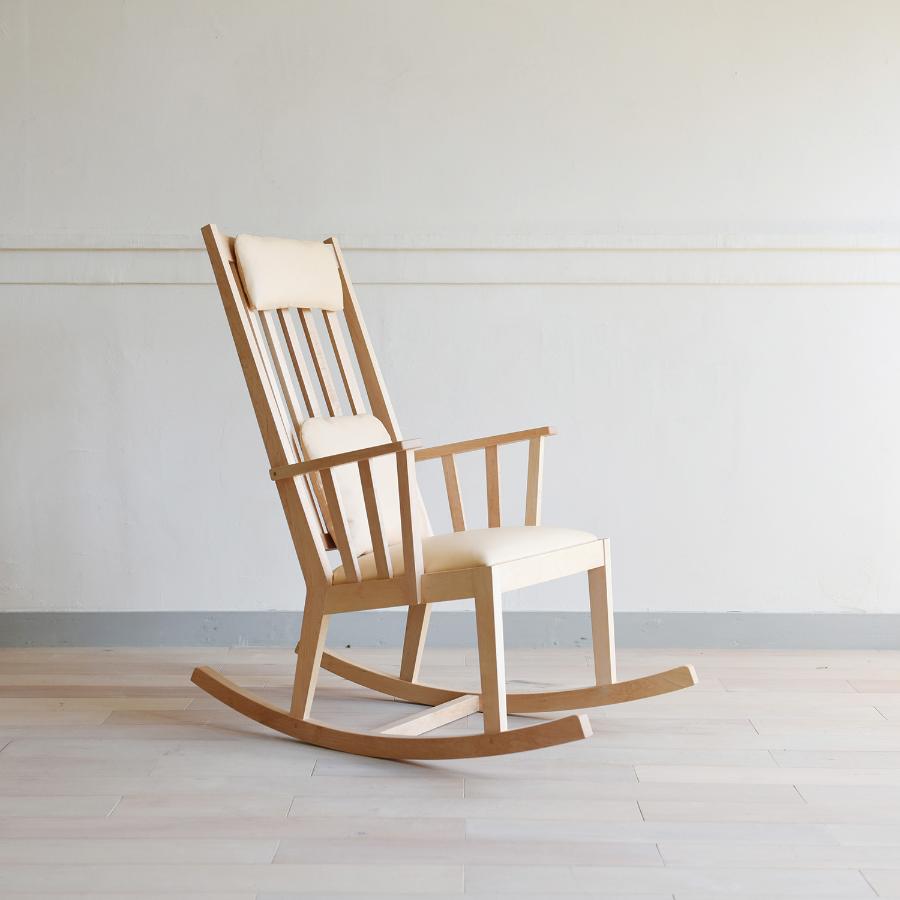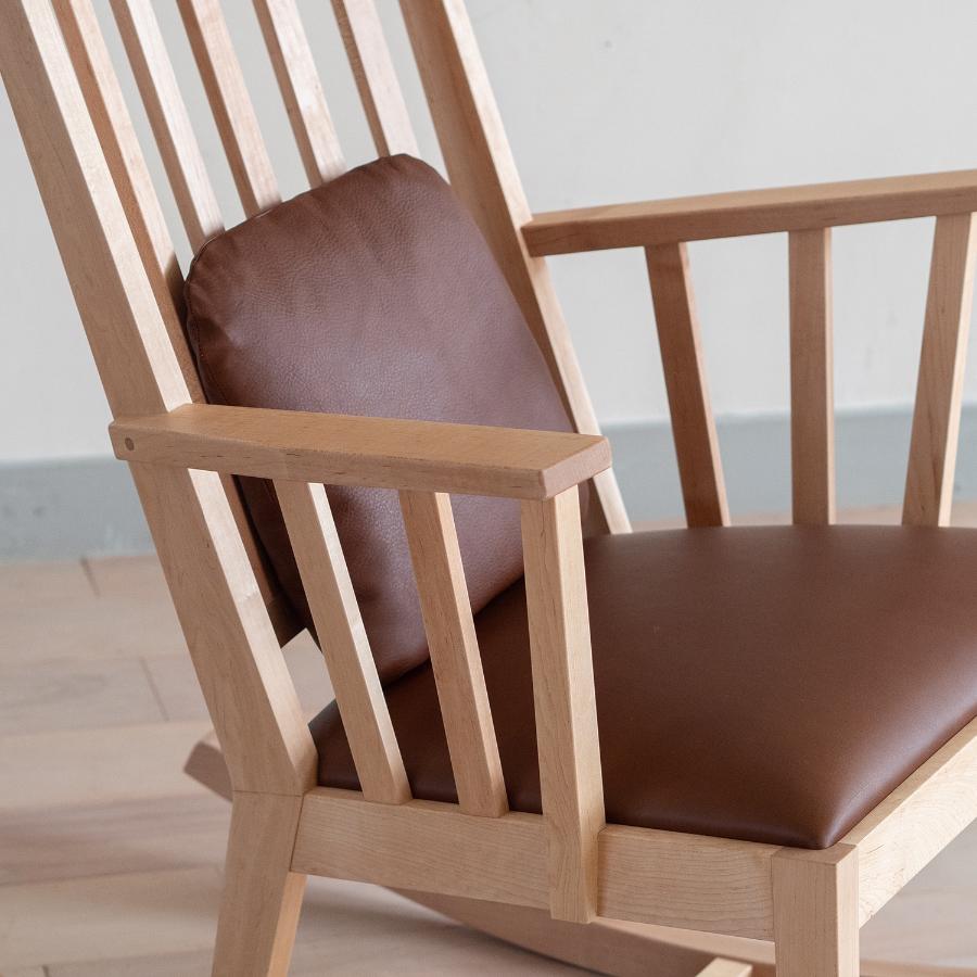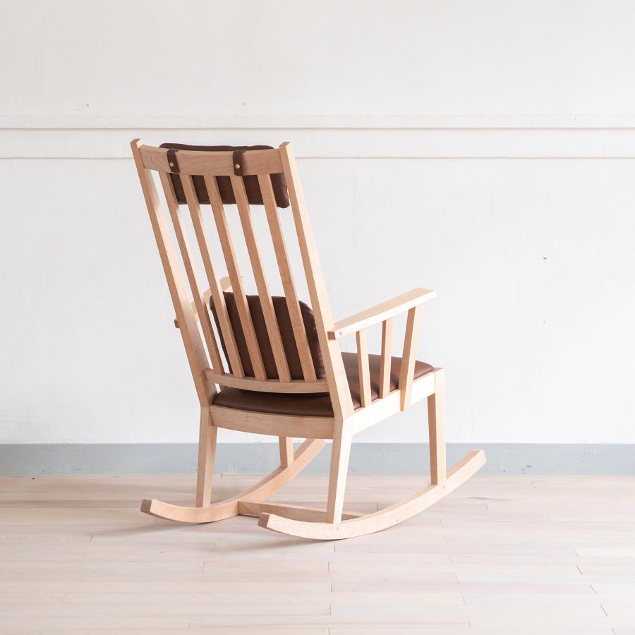北海道産の無垢材を使い丁寧に作り上げたロッキングチェア。ヘッドレストを固定する細かなパーツにも無垢材を使っています。