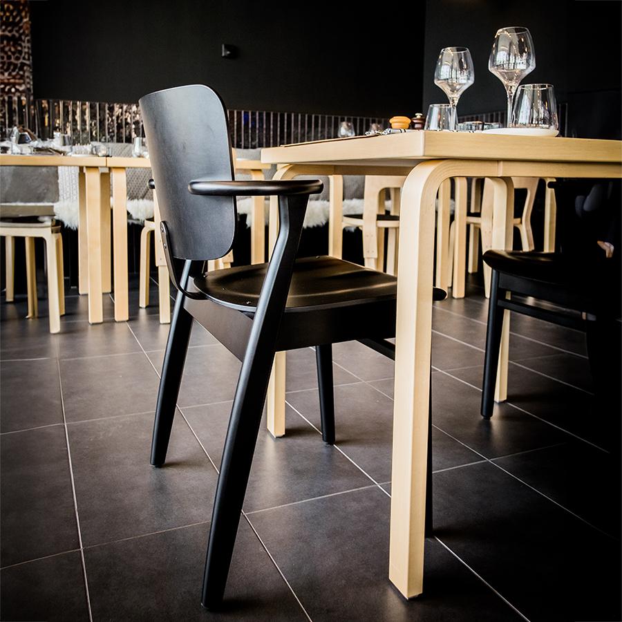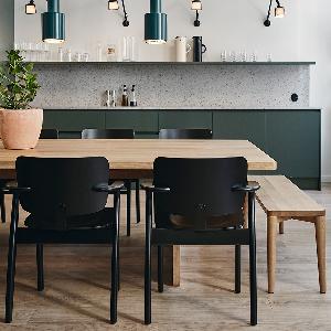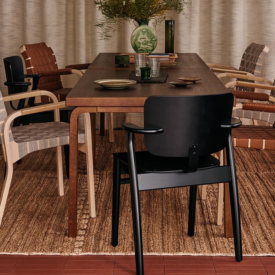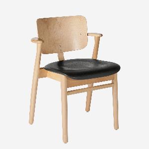 高い評価を受けたドムスチェアは、フィンランドを代表する椅子として「フィン チェア」という愛称でも呼ばれるようになります。 三次元に曲線を描く、人の身体に沿った座面など、長期間座っても疲れにくく、心地良く過ごせるデザインを追及しています。 特徴的な小さめの肘掛けは、肘置きとしての役割をきちんと果たしながら、テーブルに椅子を引き寄せやすいように考慮されています。