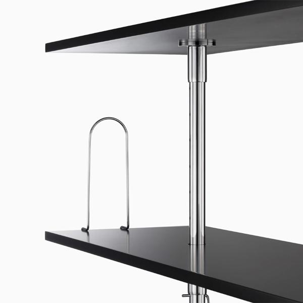 従来の大きく重厚な本棚のイメージを覆す、画期的なブックシェルフです。2本のスチールパイプが全体を支え、棚板がまるで浮遊しているような印象を与えます。現在でも十分に新鮮さを感じさせる無駄のないデザインは、当時の生活様式にも大きな影響を与えました。