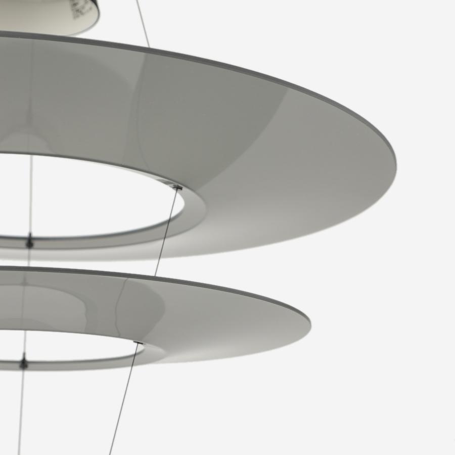 宙に漂う4枚の光のウイング。光の彫刻のような印象が、洗練された日本のミニマリズムを感じさせます。グレアを完全にカットする4枚のアクリルシェードは極細のワイヤーで吊られています。柔らかい透過光を下方にたっぷりととどけます。光源の光を直接受けるシェードの上面はマット仕上、下面は光沢仕上げとしています。2004年iF賞受賞。Louis Poulsenルイスポールセン社は1874年設立されたデンマークを代表する照明メーカー。1920年代半ばより、気鋭のデザイナーで建築家でもあったポール・ヘニングセンとの協力関係を築き、照明器具の開発を開始したことが社の発展の基礎となりました。デザインのためのデザインではなく、あくまでも良質な光を生むための「機能的で美しいデザイン」。グレアを抑え、光の反射や拡散をコントロールすることで、建築やランドスケープを理想的に見せ、空間の美しさをひきたてるようなデザインに、ルイスポールセン独自のフィロソフィーが宿っています。
