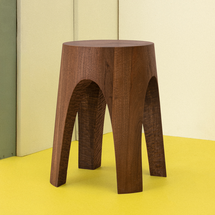 まるで丸太から彫り出したかのような、プリミティブな魅力を持つスツール。脚部の滑らかなアーチは、ボスニアの都市モスタルにかかる古い橋からインスピレーションを得ています。