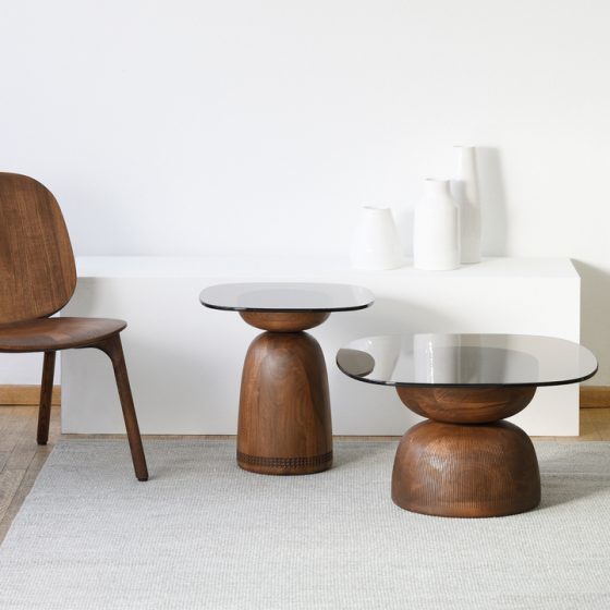 スモークガラスのエレガントな天板と、手彫りの彫刻が施されたベースを組み合わせたテーブル。異素材のコンビネーションが、モダンでありながらクラフト感あふれる空間を演出します。