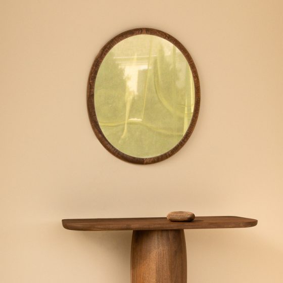 日本の「玄関」を豊かにするためにデザインされたミラー。丸みを帯びた有機的なフォルムと、フレームに施された繊細な手彫りのコントラストが、空間に温かみと上質な空気感をもたらします。