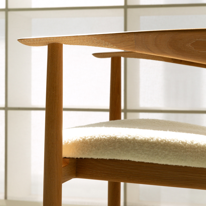 三日月のような美しいカーブを描く背もたれが印象的なアームチェア。アームの裏側にまで施されたカービング(彫刻)が、触れるたびに手仕事の温もりを伝えます。