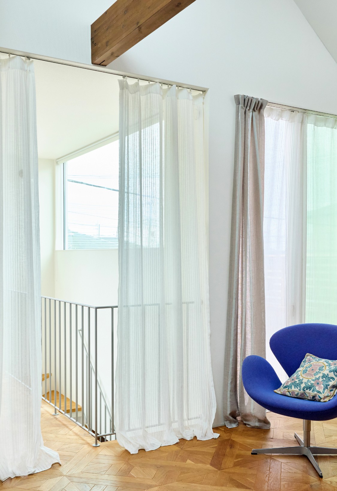 「子どもが生まれるのに合わせて、引っ越した際に購入しました。リビングで過ごす時間が増えるので、部屋が柔らかい雰囲気になることや、子育てグッズとの相性を考えて選びました。お気に入りポイントは、お部屋がパッと明るくなり、縦ラインの柄が天井を高く見せる視覚効果があることです。また、散らかりがちな子どものおもちゃとも不思議と相性がよく、空間がまとまって見える気がします。デリケートそうに見えて意外と耐久性があり、子どもが少々引っ張ってもびくともしないのには驚きました」
