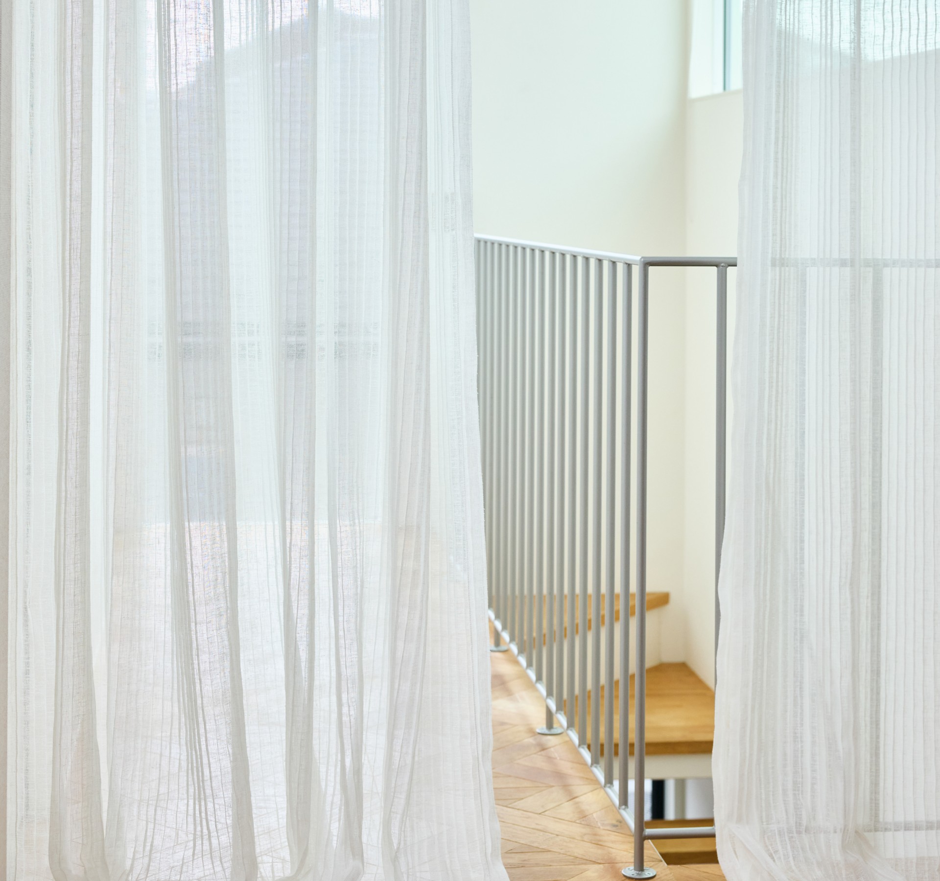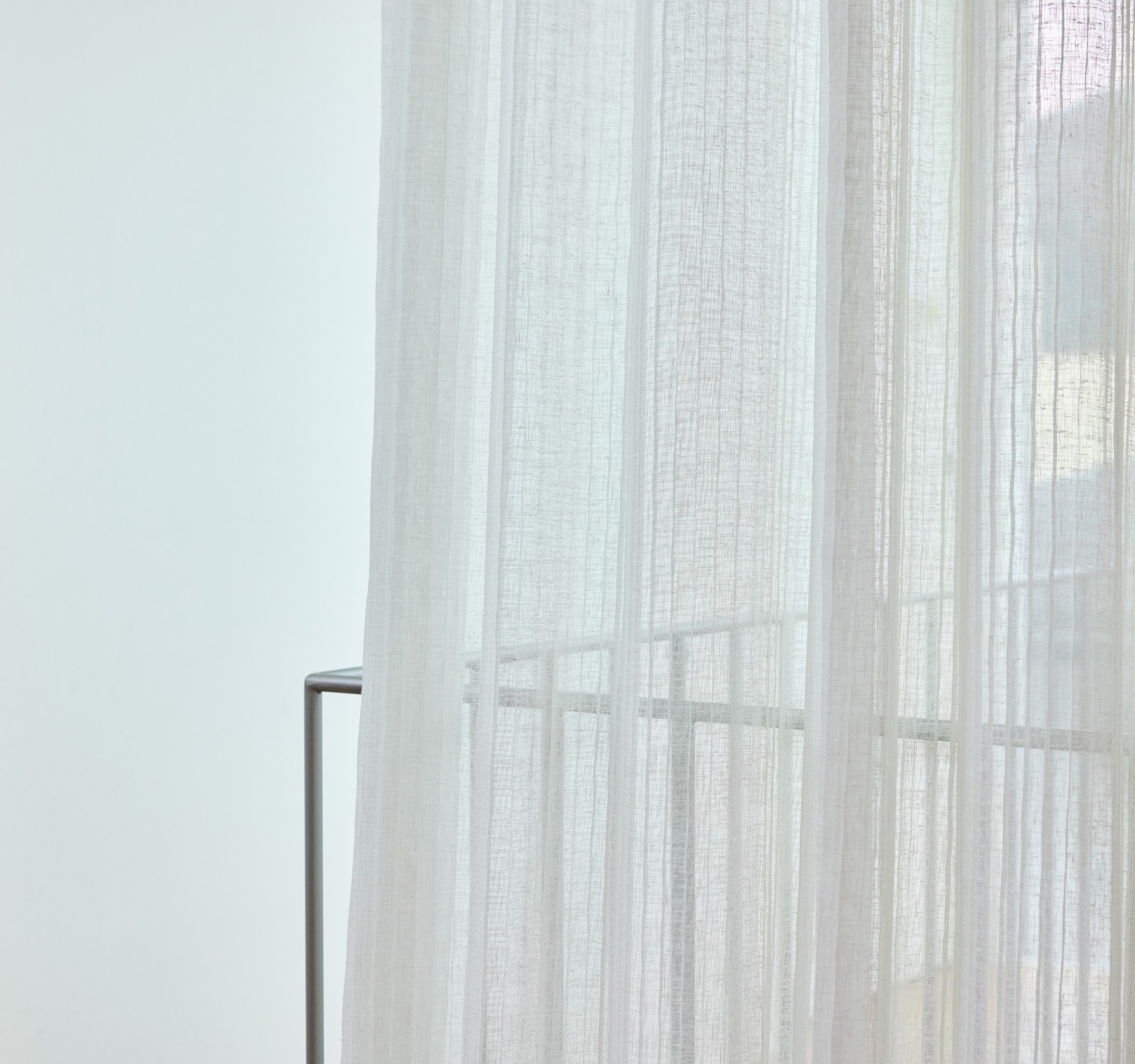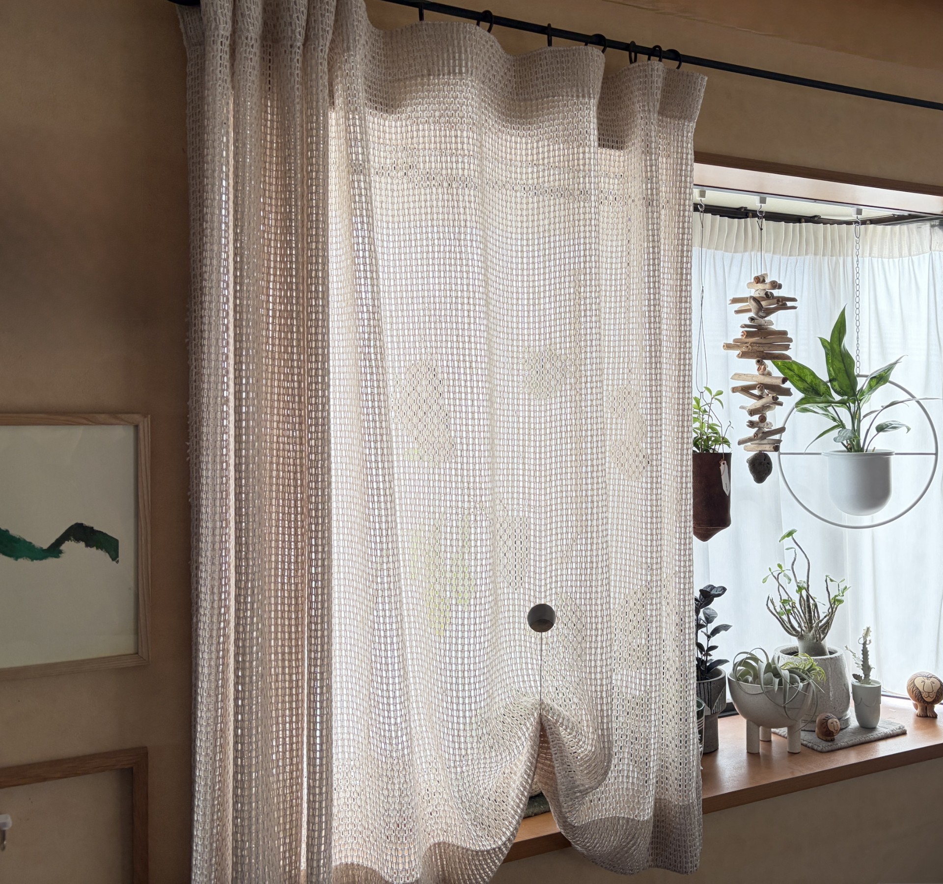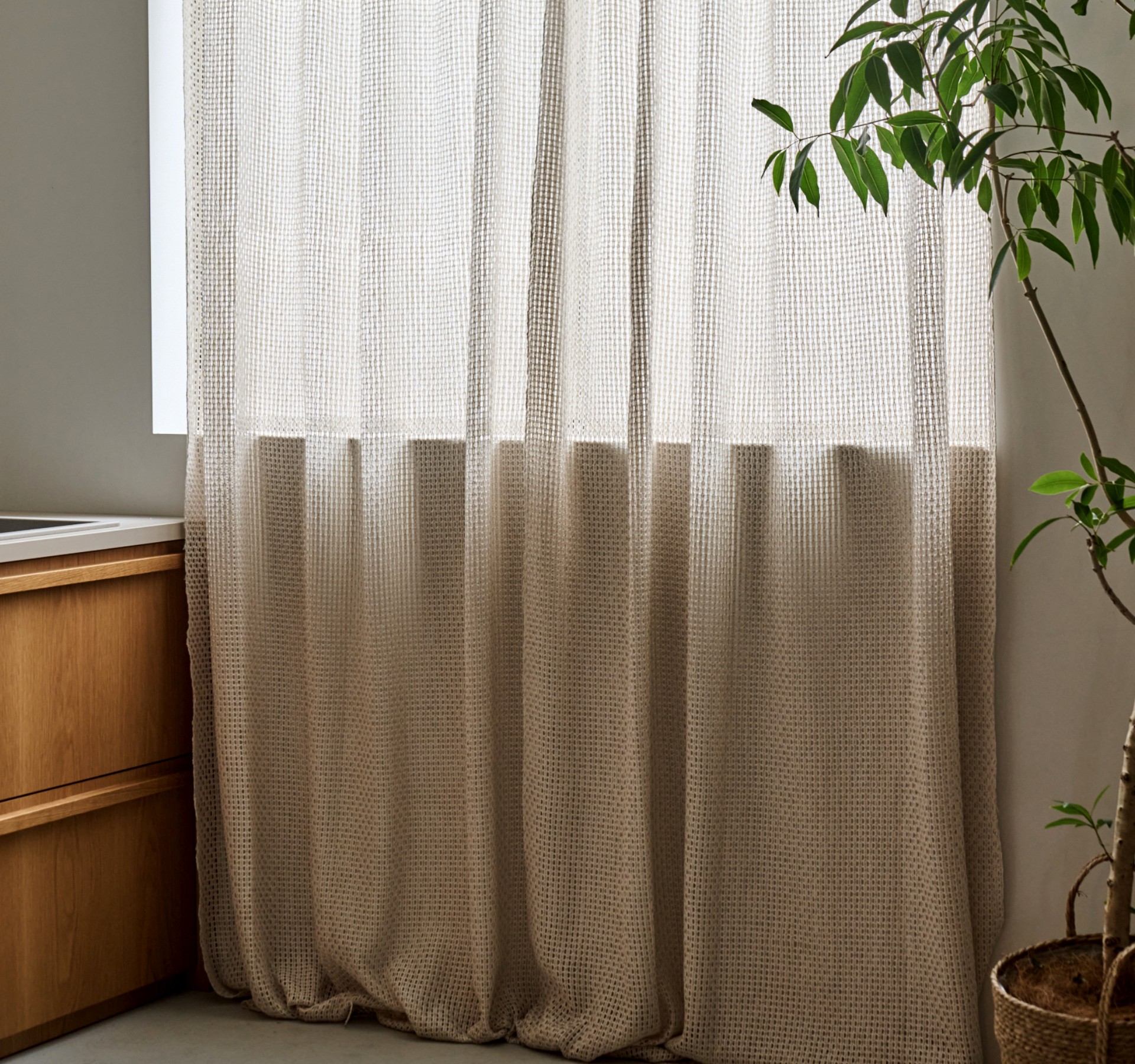 「繊維の質感が光に透けると非常に美しく、1枚使いで間仕切りとしても優秀です。特にグレーはどんなインテリアにも馴染み、木製家具との相性も抜群。厚地カーテンだと重厚感が出すぎるし、レースだけだと薄すぎるというわがままを叶えてくれました。ほどよくカジュアルでありながら、品質の良さと絶妙な質感のテキスタイルです」