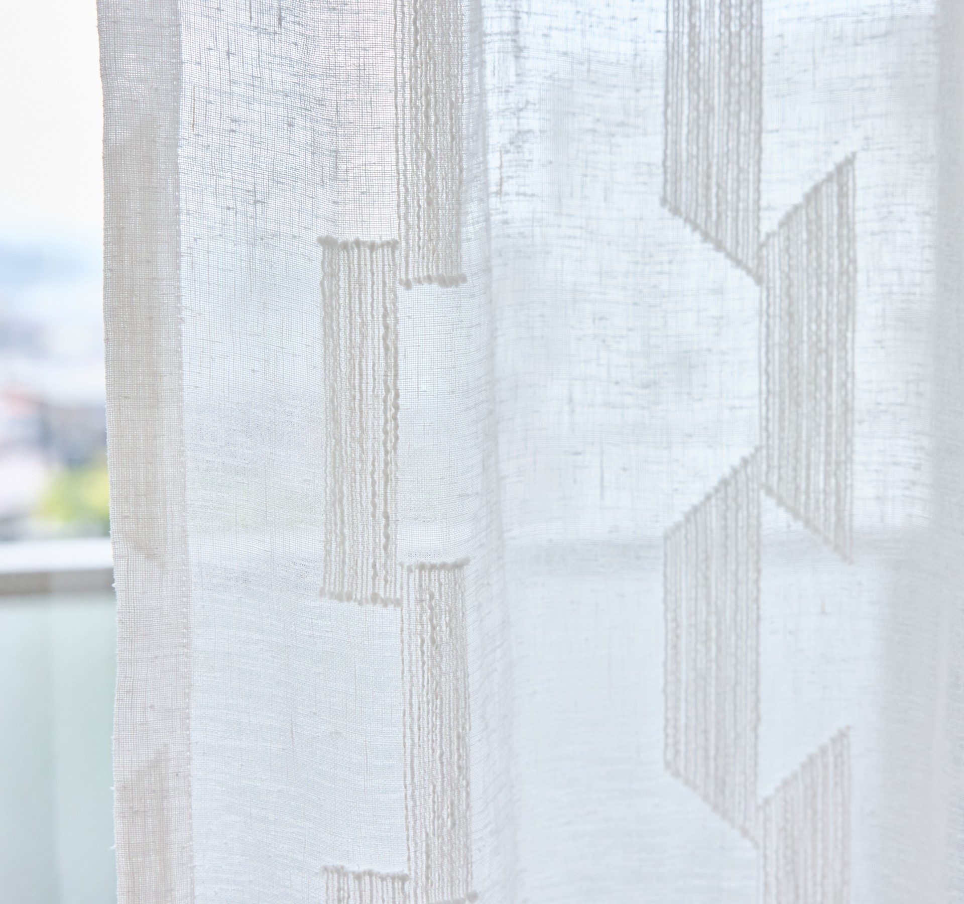 ジャガード織で立体感ある模様が印象的な「VERT(ヴェール)」。ポリエステルに麻と綿を混紡した生地は、光をやさしく採り込む透け感と柔らかな手触りが特徴です。日中は差し込む光で刺繍の陰影が際立ち、床や壁に美しい影を映し出します。