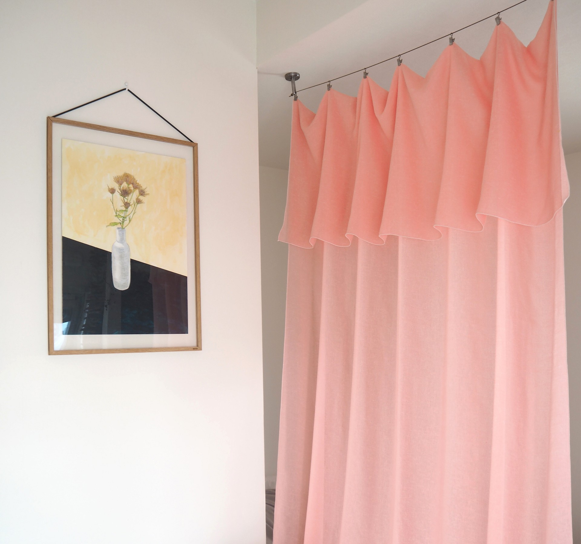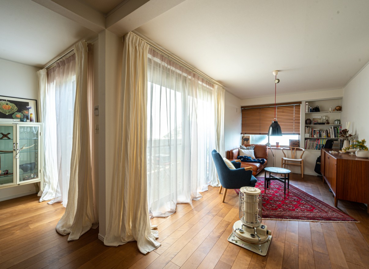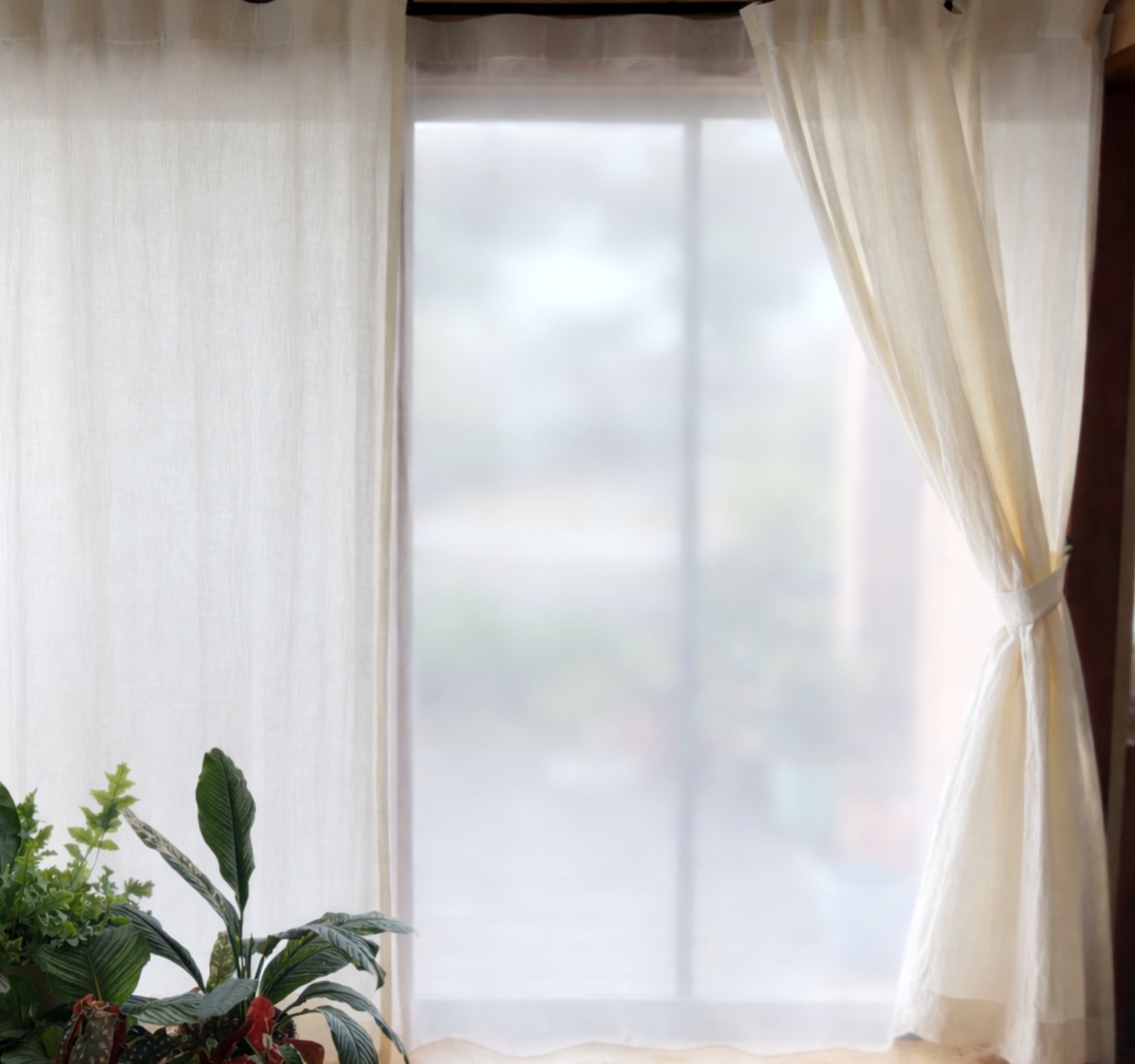 「ラフな素材感が、ナチュラルなインテリアと相性が良く、カジュアルになり過ぎないところが気に入っています。エメ独特のシワ感のおかげか、薄手ながらも同じような厚みの生地より保温性があるように感じています。カラーは馴染みの良いナチュラルを選びましたが、もう少し色を取り入れて、冒険してみてもよかったかも。ドレープが描くシルエットが美しく、窓を眺めるのが楽しみになりました」