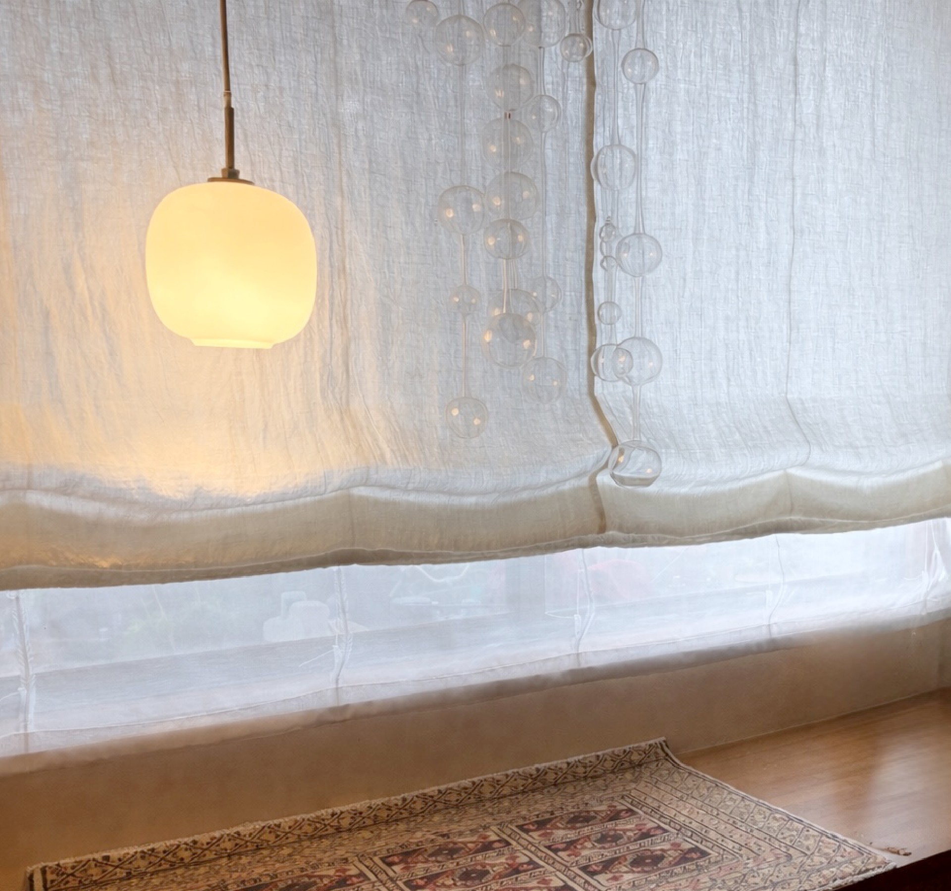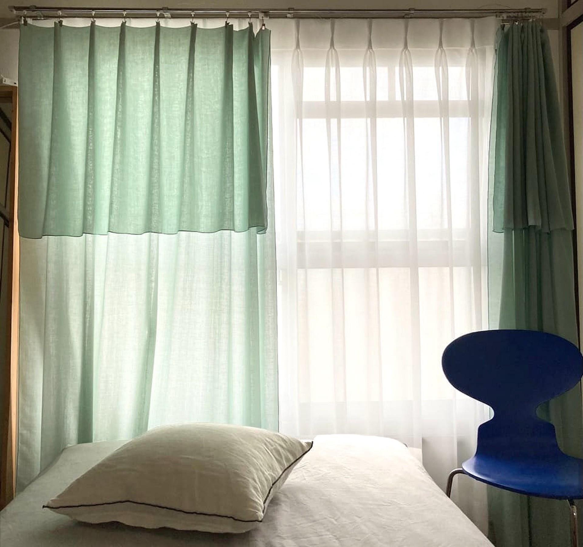 「薄手で柔らかく、風にふわっとなびく質感が気に入っています。きれいなミントグリーンで、透けすぎず、光をほどよく通してくれるところもお気に入りです。オンラインショップで見ると「緑すぎるかも?」と心配でしたが、部屋に自然と馴染んでくれました。クリップの数で印象を変えられるのも楽しいです」