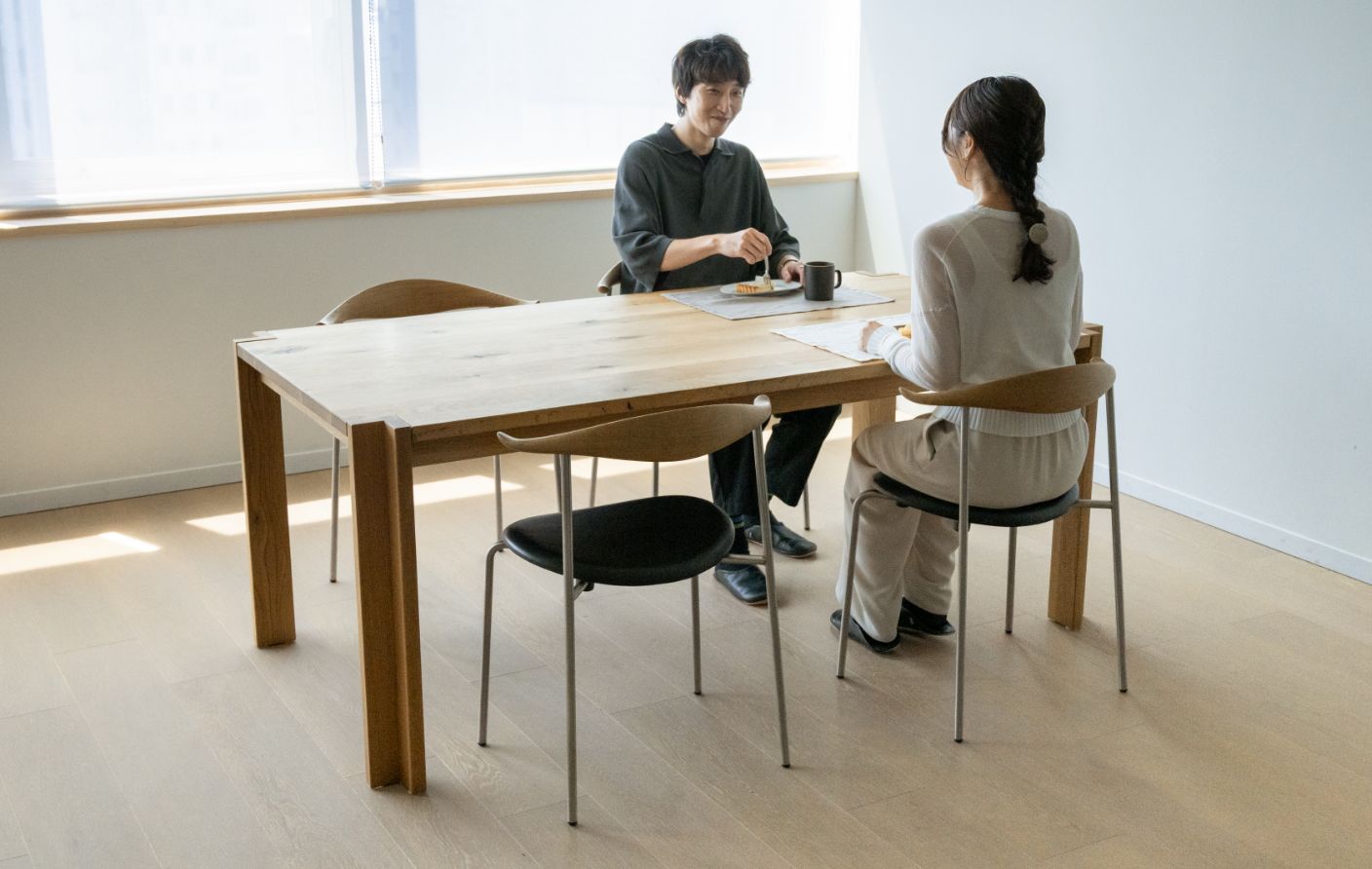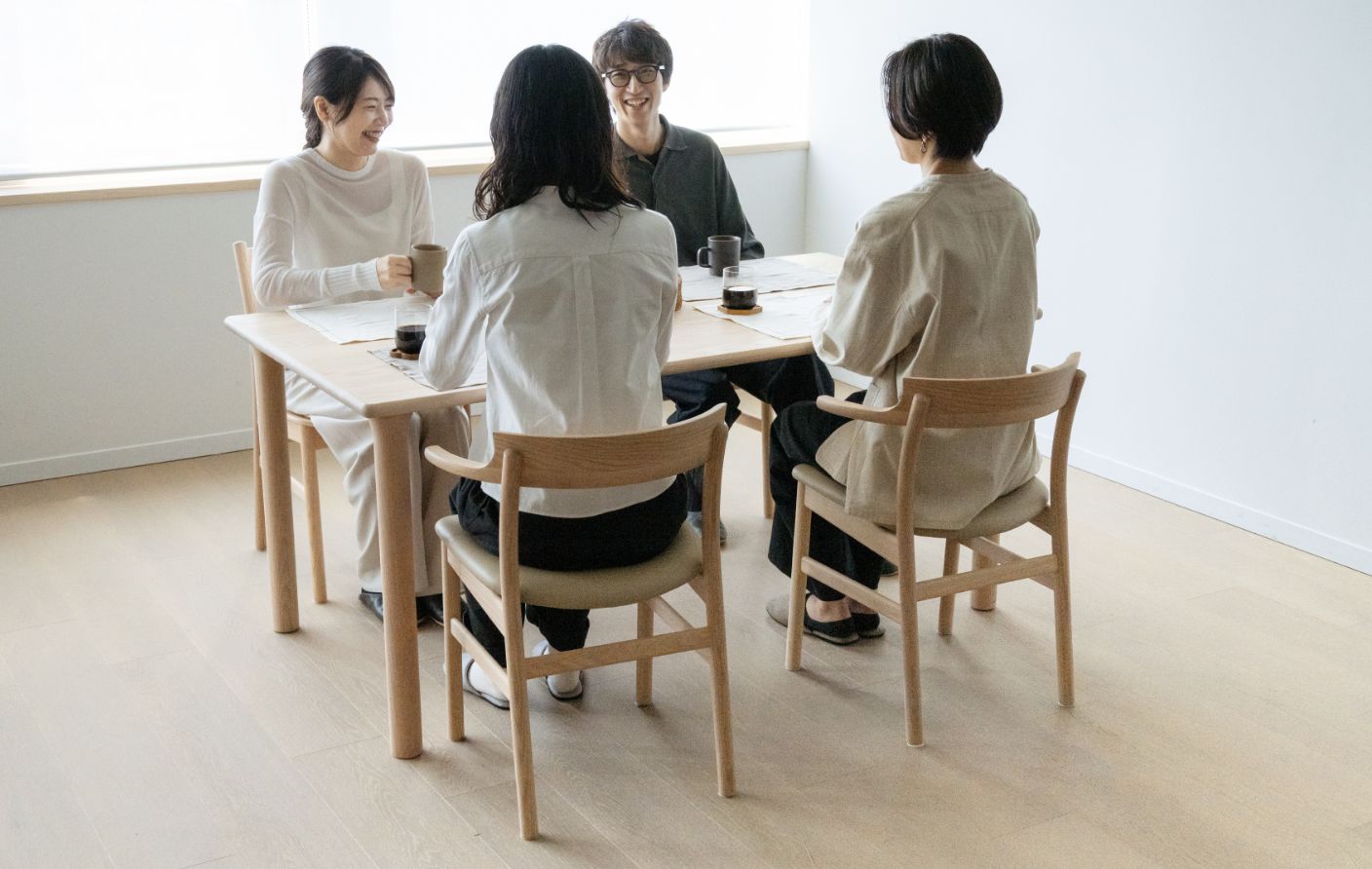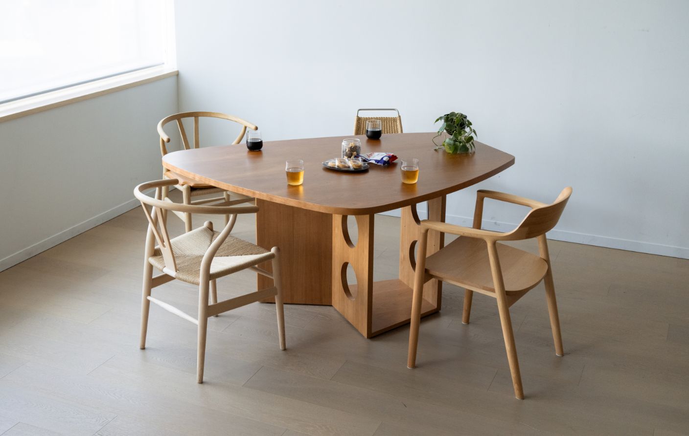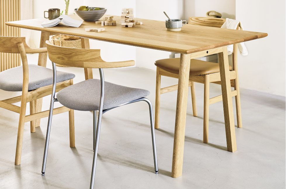 そして一番の魅力は、テーブルを囲んだ時に生まれる『心地よい距離感』。向かい合った人と視線が真正面からぶつからない、この少しのズレが緊張感を和らげ、会話を自然と弾ませてくれるんです。「デザインの力で、暮らしはもっと豊かになる」。そんなことを教えてくれる、時代を超えて愛される名作テーブルです。M21シリーズ以外にも変形デザインのダイニングテーブルをご用意しています。