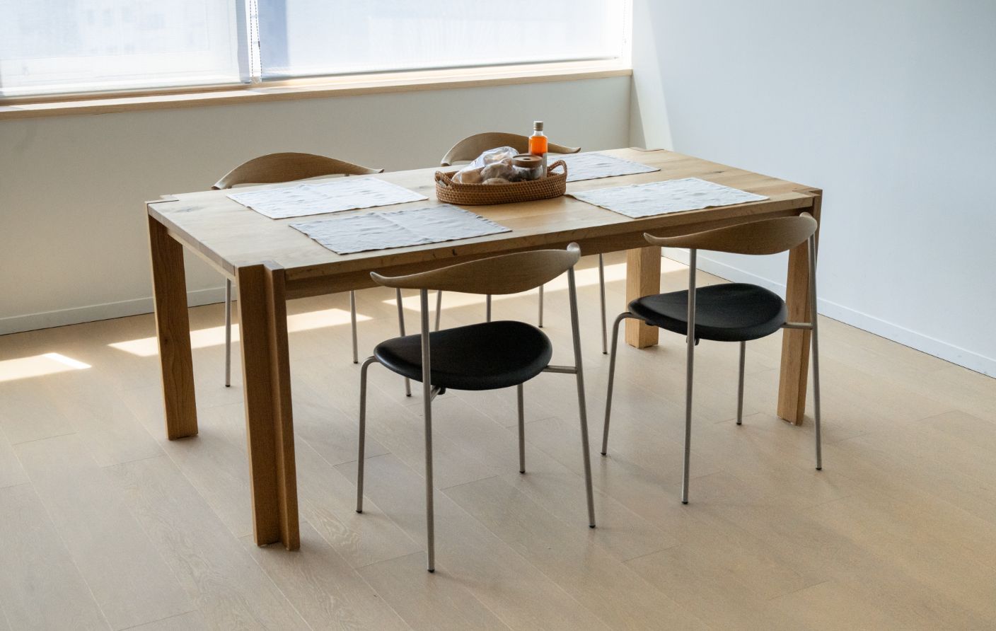 角に脚のある4つ脚のデザインは、足元が広く座り心地のよさが最大のメリットです。真ん中に脚があるデザインは、足元のスペースが狭くなりますが、出入りがしやすく、どの方向からでも座りやすいのが特徴です。ダイニングテーブルを置く位置や生活動線の快適さをポイントに選んでみてください。SOUPシリーズのAレッグタイプはどちらのよさも兼ね備えた、おすすめのデザインです。