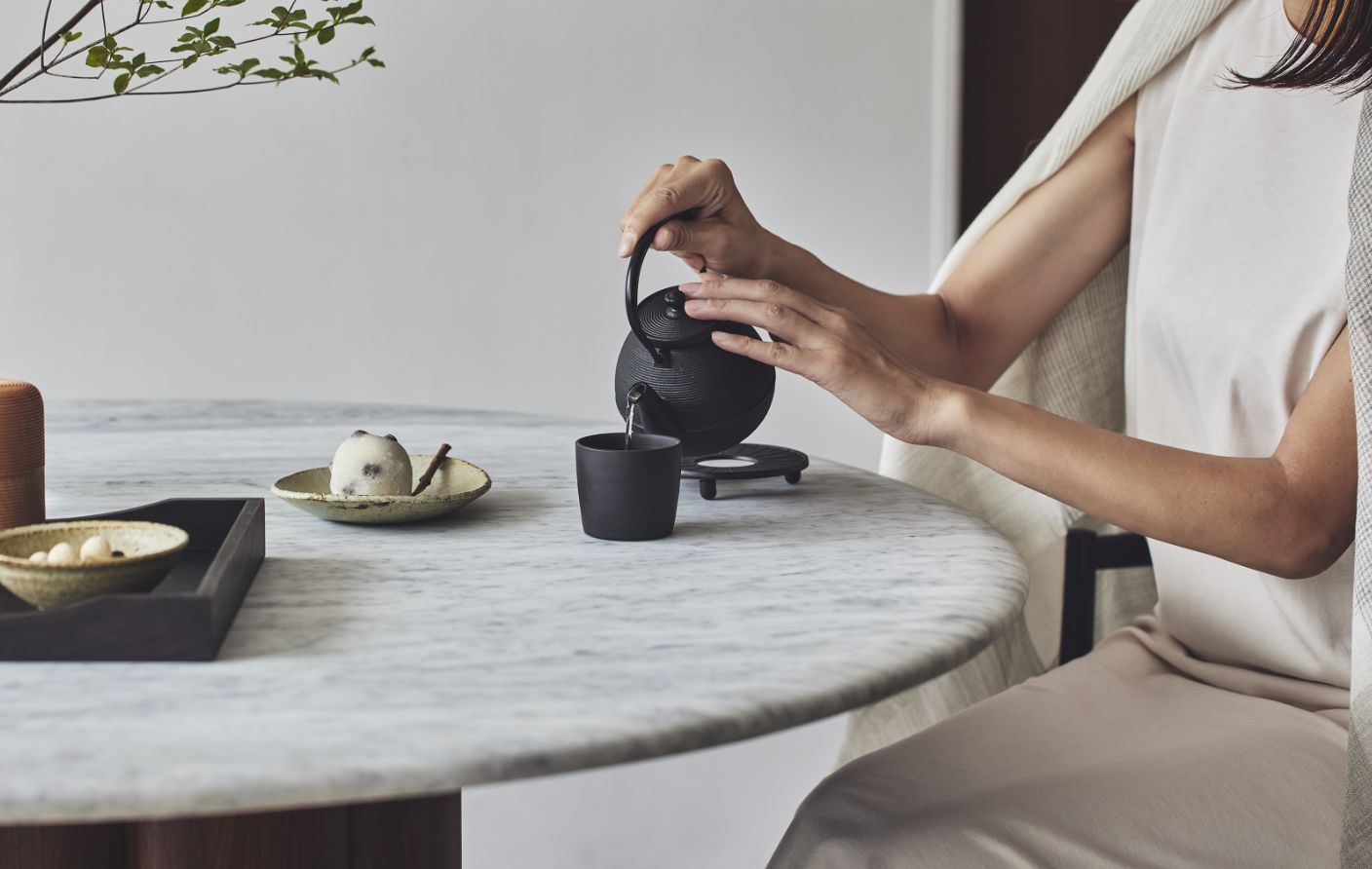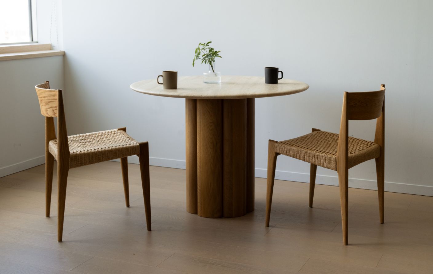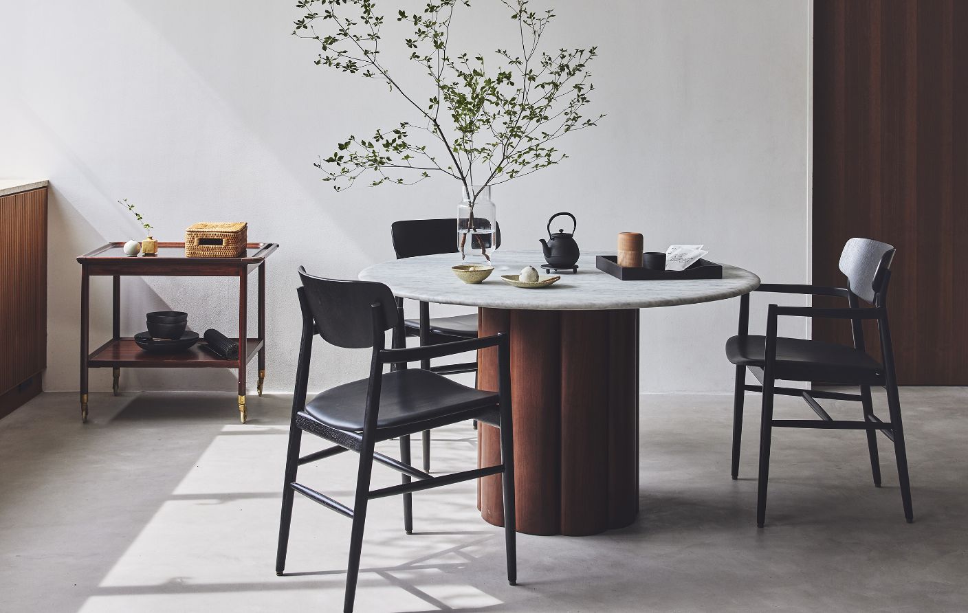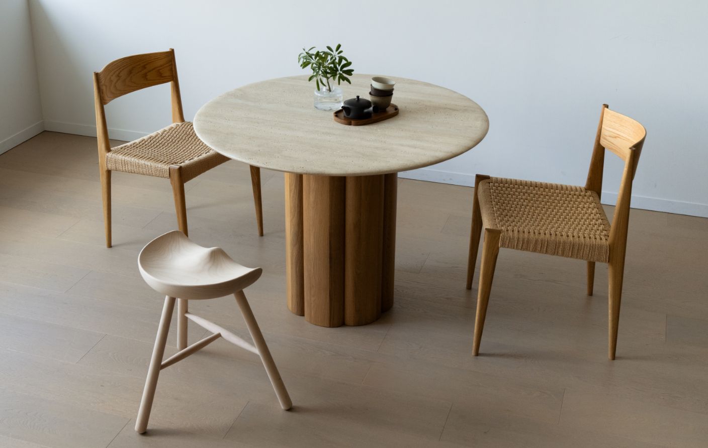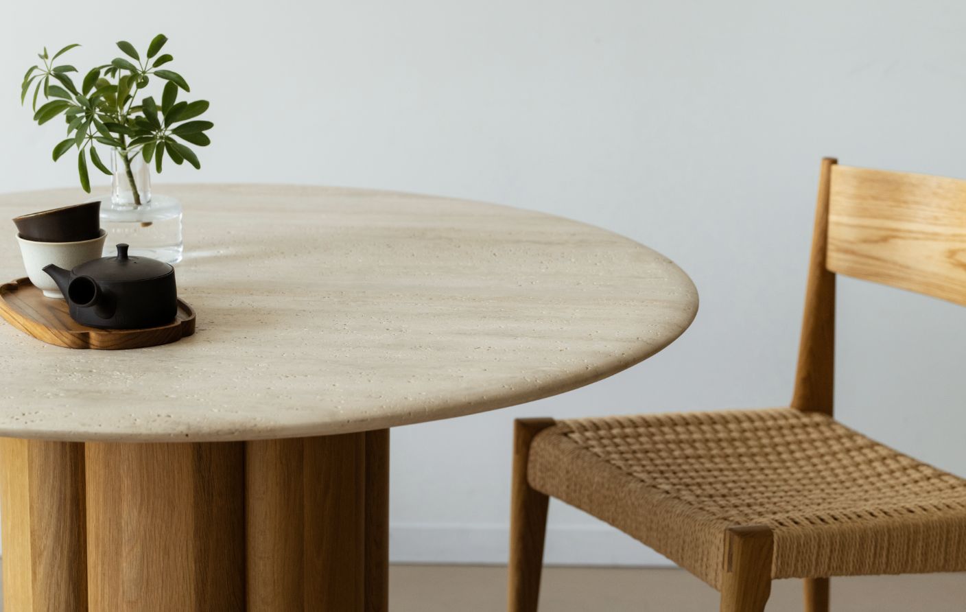 四角いテーブルと違い、円形は壁に対して平行に置くといった『向きの制約』がないので、どんな間取りにも柔軟に配置できます。さらに周りを回れるスムーズな生活動線も確保しやすいと最近ますます人気が高まっています。とくにご紹介したいのが、木と大理石を組み合わせた彫刻のようなNATADORA社のKORAテーブルです。