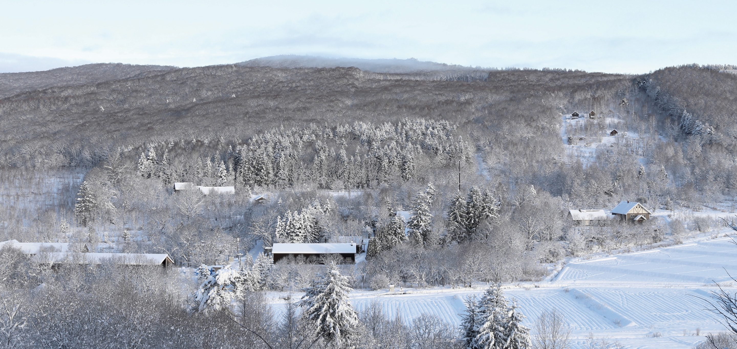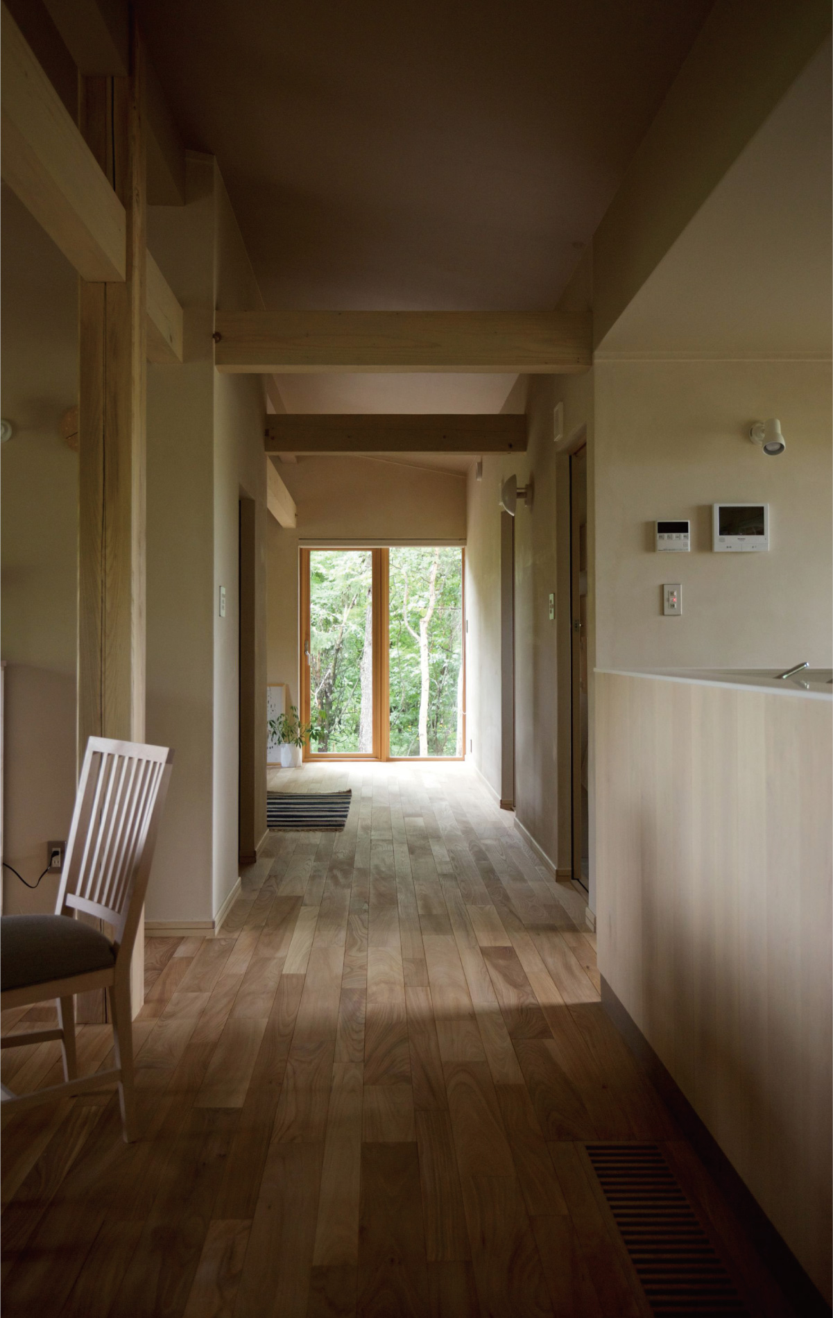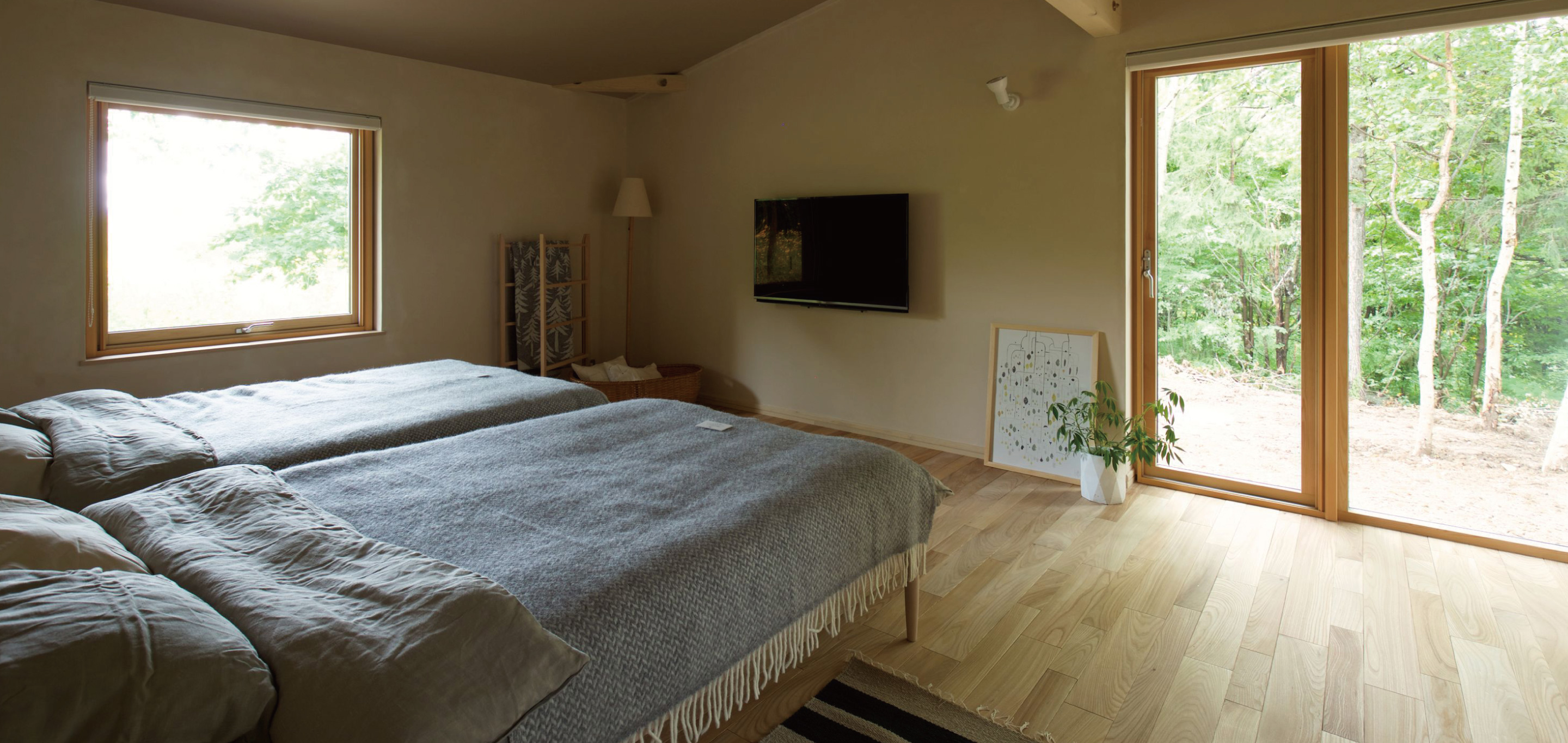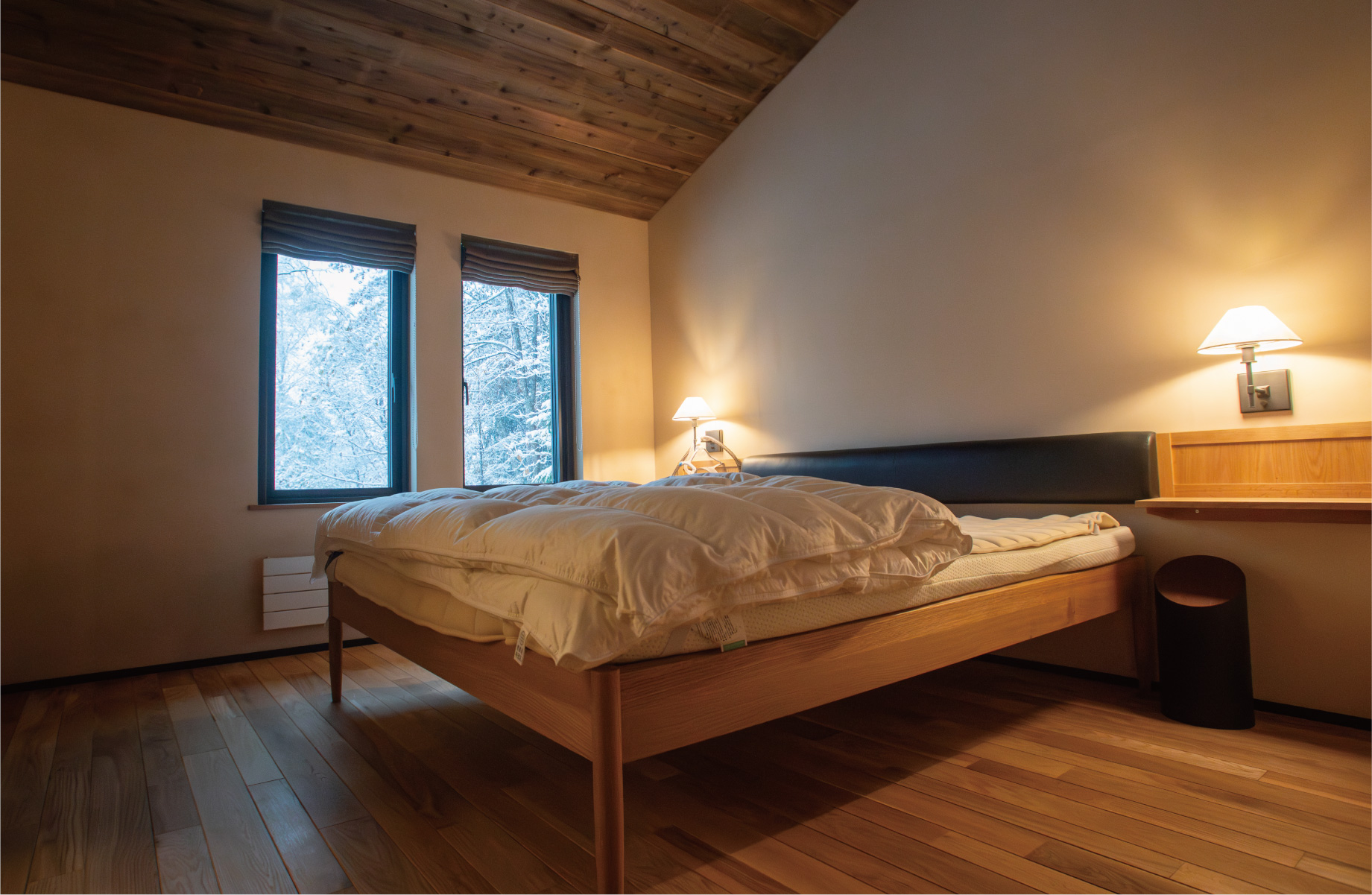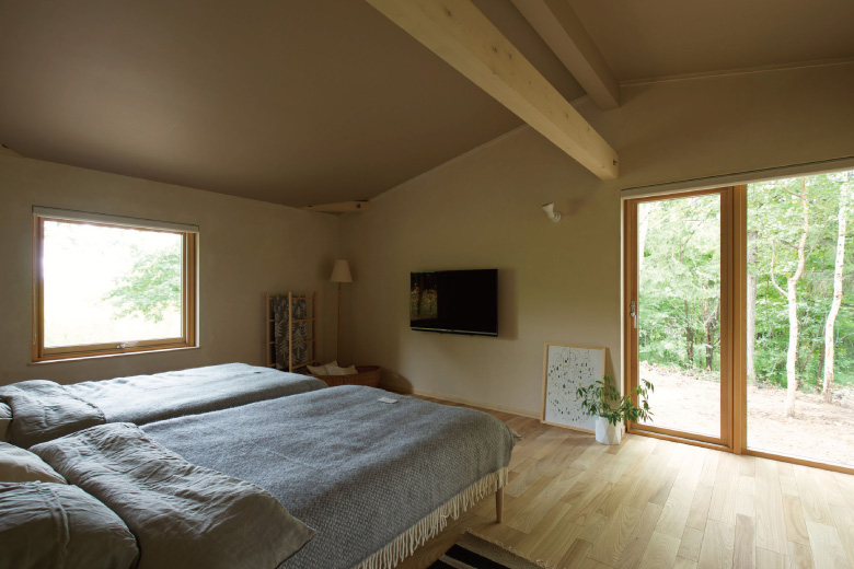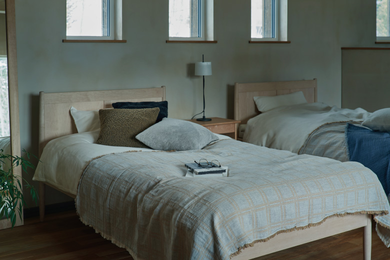 時に好みを語らいながら、北海道という厳しい環境下でなすべき仕様やディテールを詰めました。壁には驚くほど厚みある木材とたっぷりの断熱材を採用。Hさんたっての希望で、定石では南向きに置くテラスをあえて西に。これは森を眺めるためだといいます。寝室の一つには、大雪山の山並みを表現した壁面のアートワークを施しましたがこれも北の住まい設計社製。二人の語らいが生み出したこだわりの住まいが北の大地に根差します。