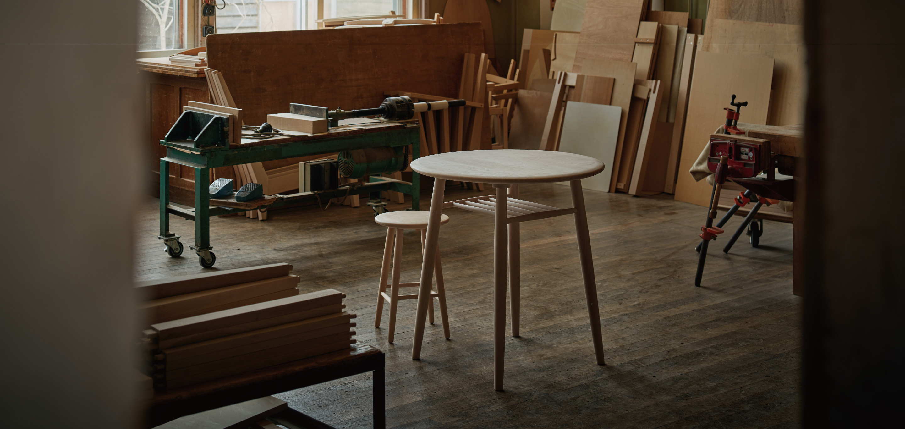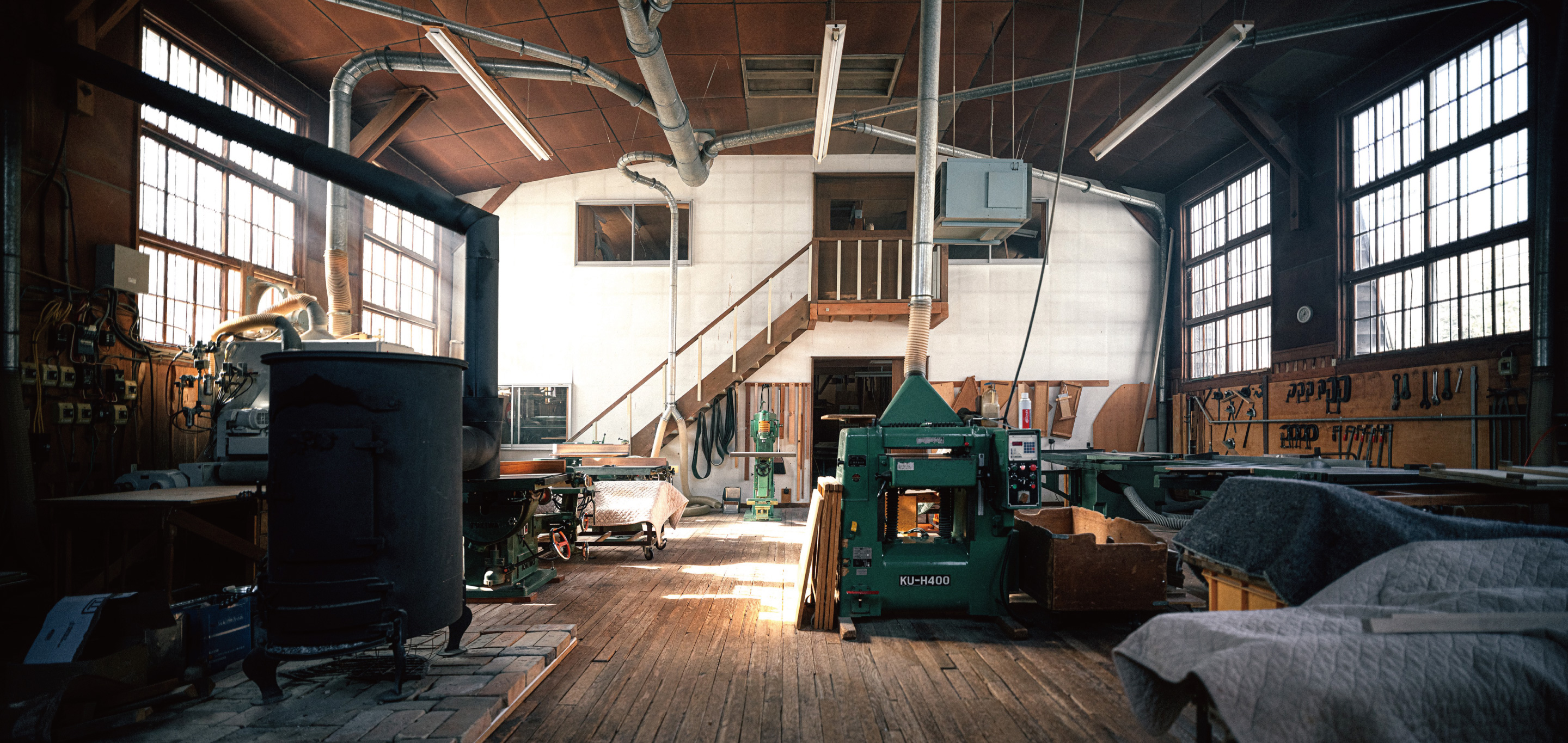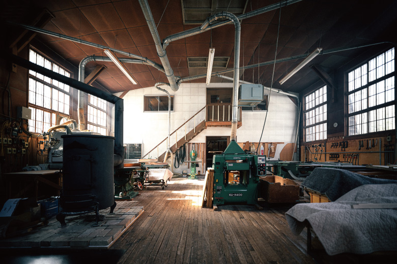 かつての体育館を再生した工房。使い込まれた工作機械、整然と並ぶ道具、そして味わい深いフローリング。かつて子どもたちが過ごした空間の趣きは継承しながら、誠実な家具づくりの現場へと再生しました。