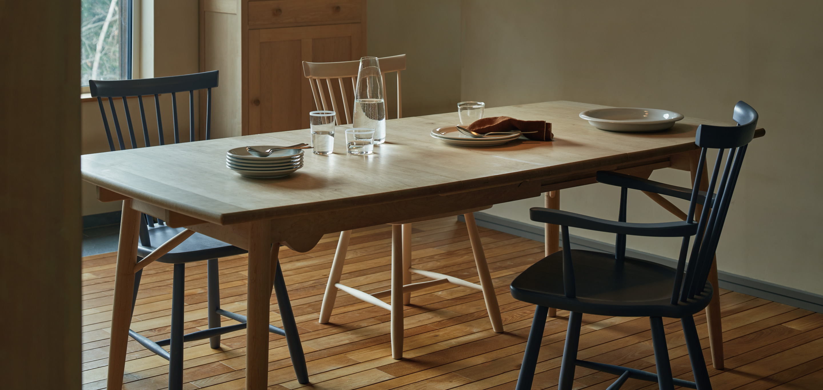 北海道・東川町。大雪山の麓にある廃校を工房とし、1978年から誠実な家具作りを続けている「北の住まい設計社」。「自然のリズムと共に生きる」を信念に、全ての製品は希少な北海道産木材を採用し、一人の職人が一つの家具を最後まで仕上げています。