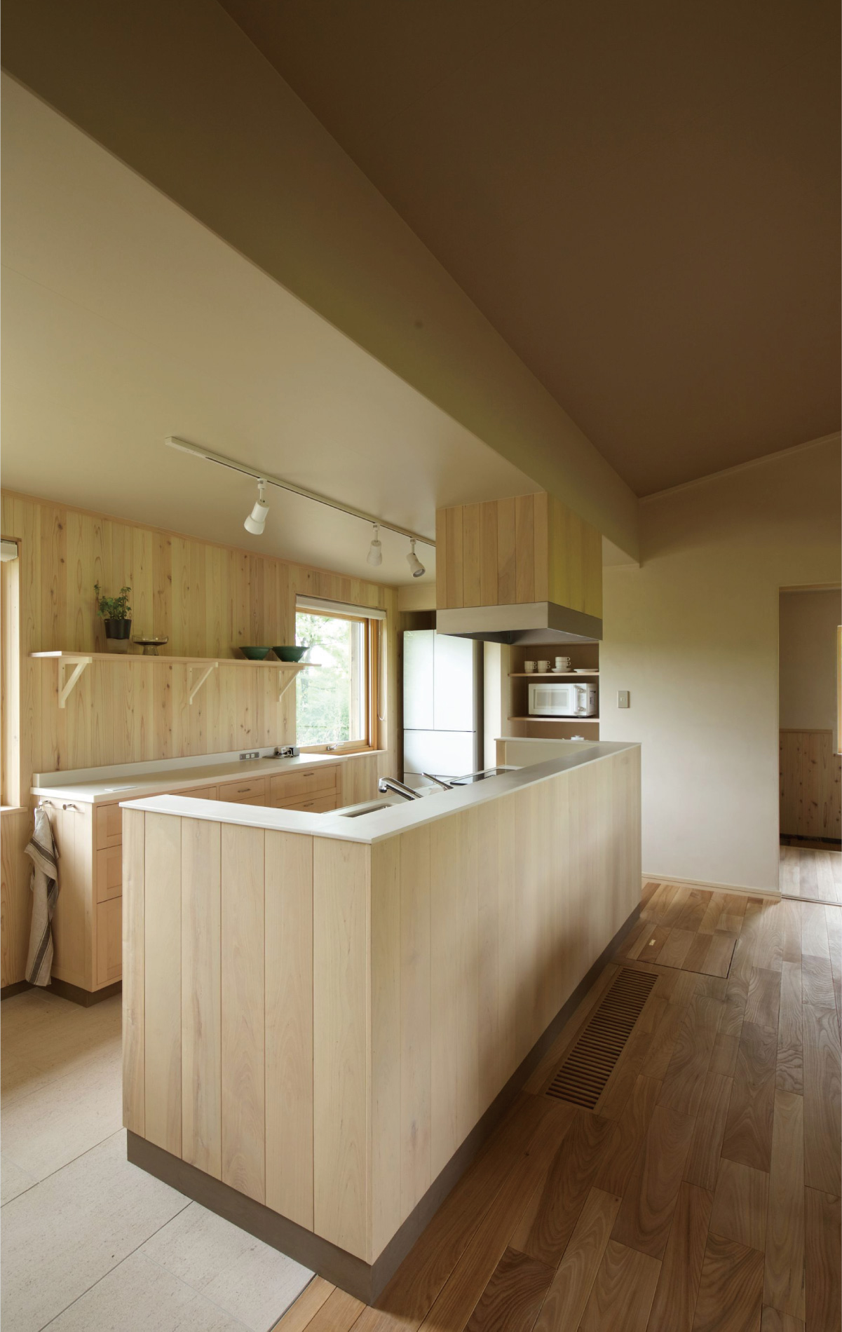 大学教授として国内外の多くの地で講演した経験があるTさん。夫妻が全国を巡るなかで最も心惹かれた風景が美瑛の雄大な自然だったといいます。仕事に区切りがつき、夫妻は白樺の林に囲まれた丘陵の家へ移住します。家、そしてほとんどの家具を手がけるのは北の住まい設計社。家具に使うのは白い木肌の北海道産イタヤカエデです。柔らかく明るい色が建築と美しく調和します。