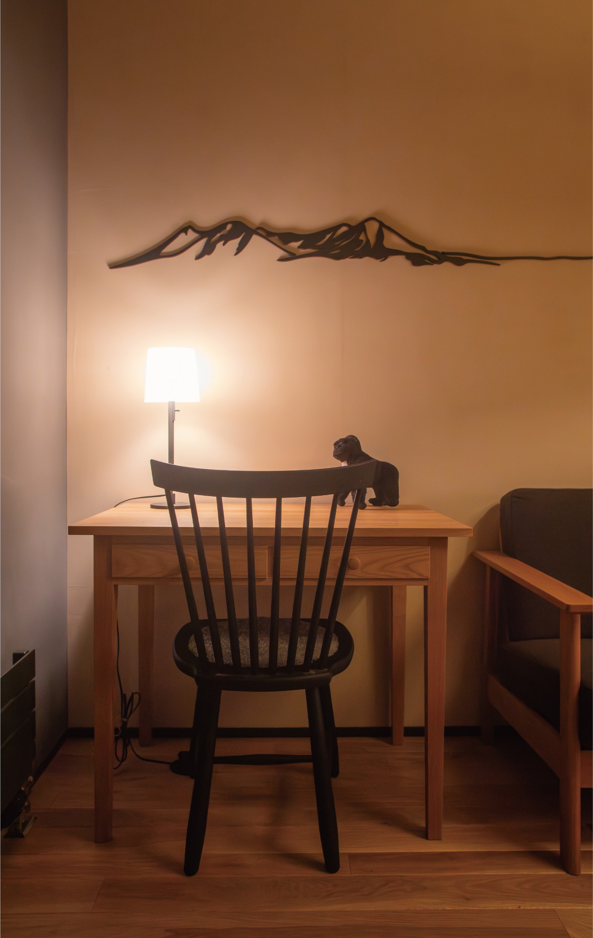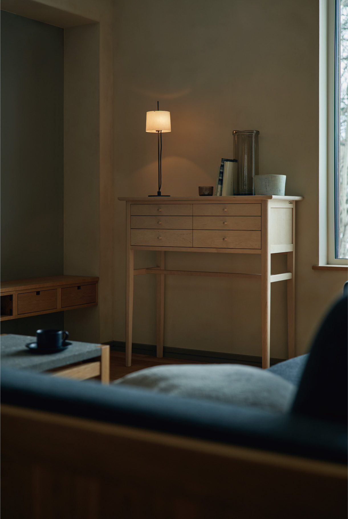 奥様の実家は銘木問屋。そんな背景から木材に詳しく、北の住まいの家具のディテール、素材の取り合わせ、そしてデザインのセンスに心惹かれたといいます。設計とともに家具も夫妻のライフスタイルに沿って選ばれたものです。造作家具とともに置き家具の魅力もしっかり打ち出すこと。たとえば収納も機能に留まることなく、そこにあることで空間がより豊かになる存在を意識しています。たとえばそこに照明を置くと、奥行きのある光が。夕方からゆっくりと夜に向かう時間、温かな光を夫妻は楽しみます。
