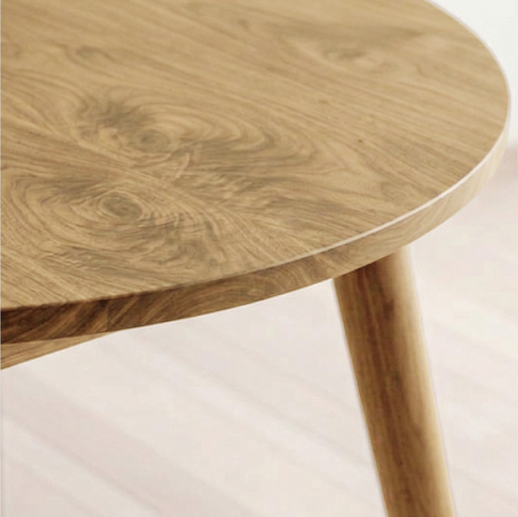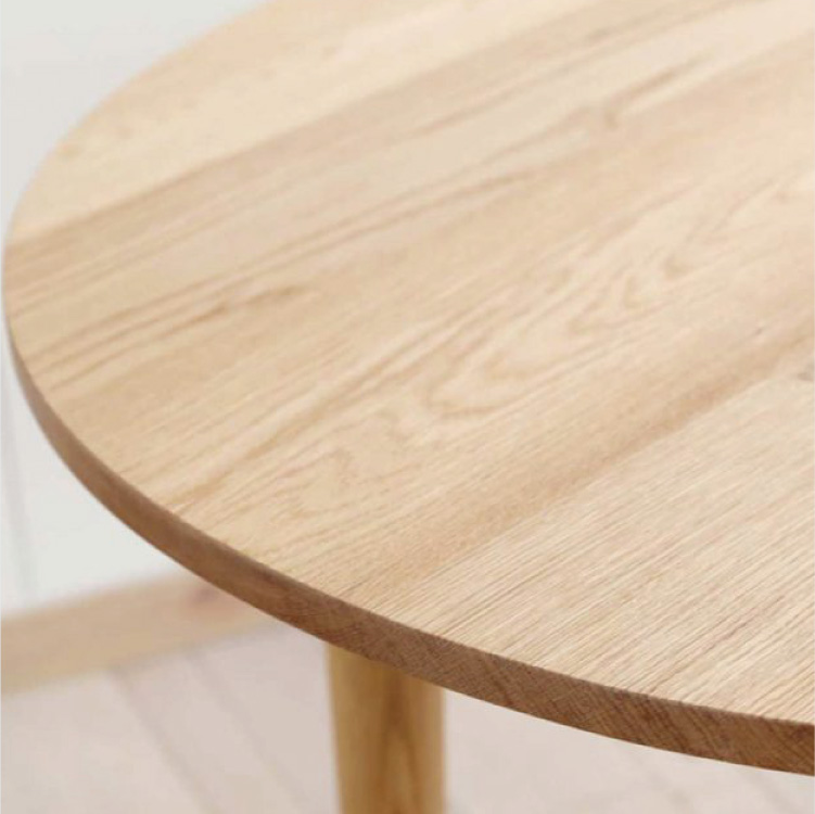 落ち着いた茶色で、ナラ固有の美しい木目があります。適度な硬さがあり、加工でも扱いやすい、とても素直な木材です。表情も豊かで家具材として加工がしやすく美しい仕上がりになるため、過去には多くの道産ナラ材が切り出され、海外への輸出もされてきました。風格のある家具に仕上がる、魅力的な木材です。また、「虎斑(とらふ)」と呼ばれる模様があるのが特徴です。目立つものは天板などには避け、裏や脚などに使用しています。