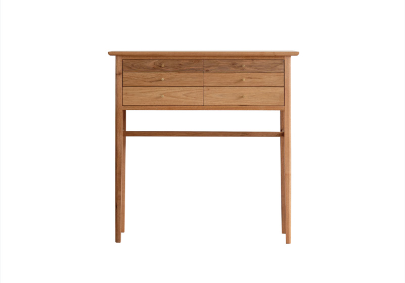 茶褐色で艶があり、木目の美しいオニグルミ。イタヤカエデやナラに比べると、柔らかく軽い材質です。狂いが少なく加工性に優れ、家具材としても人気の樹種です。北海道産のものは特に良質といわれていますが、年々その供給が難しく稀少なものになりつつあります。製作できる数に限りがあるのも、この材の価値を物語る魅力のひとつです。また、落ち着いた色合いが空間に馴染むのが特徴です。素材の良さを引き出すため、丁寧な手仕事によって美しい家具へと仕上がります。