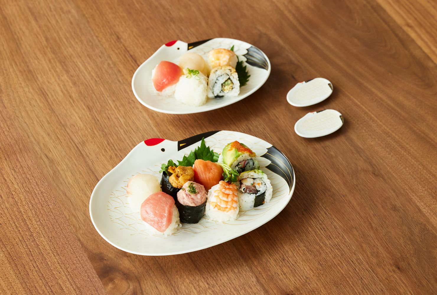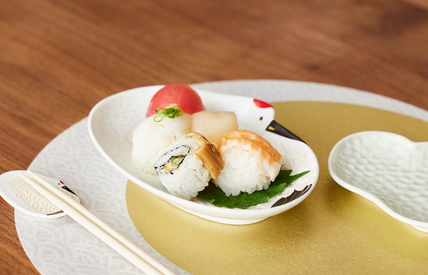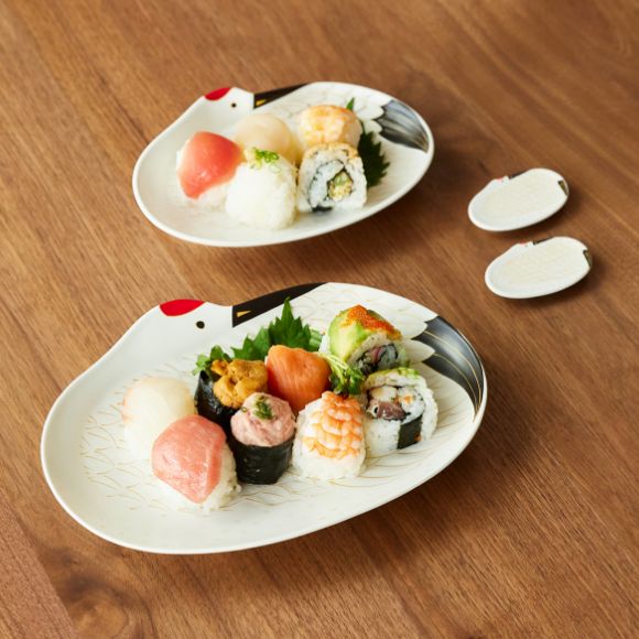 長寿の象徴、鶴をモチーフにしたプレート。可愛らしい絵柄と有田焼らしい華やかな印象で、ハレの日の食卓を彩ります。サイズは2種類。大きめを大人用の取り皿に、小さめをお子様用の取り皿にと使い分けるのもおすすめです。