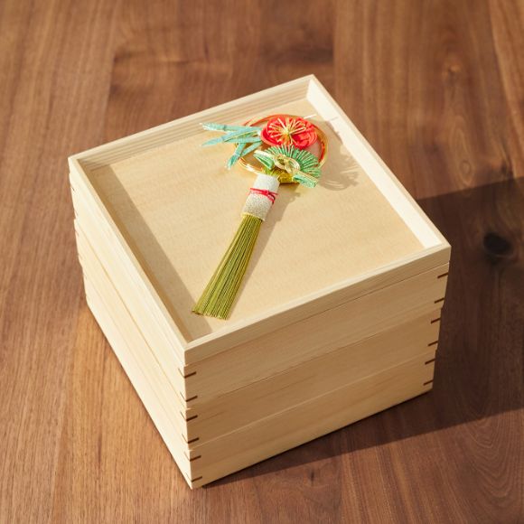 木目が細かく美しい栂(つが)の3段重に小鉢を収めた、