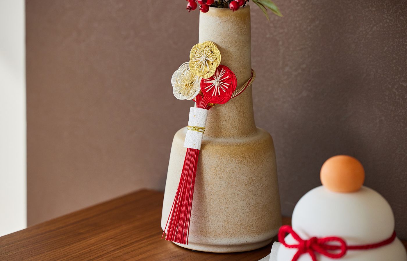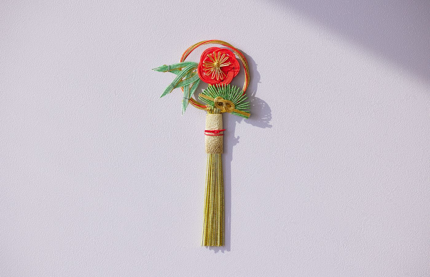 京都の伝統的な水引つくりの技を生かしたお正月飾り。和室からナチュラルな空間まで幅広く馴染みます。手軽に飾れるコンパクトなサイズも魅力。ドアや壁に掛けるのはもちろん、花瓶などの普段のアイテムと組み合わせることで、お部屋をお正月ムードに彩ります。