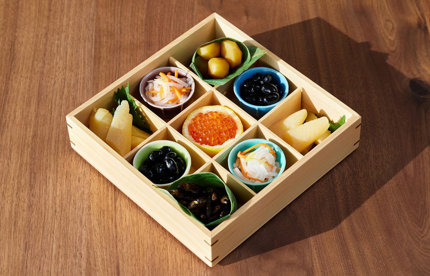 十字に仕切った1段目のお重には、おめでたい梅型の小鉢で華を添えて。梅は生命力の強さから「出世、開運、繁栄」の象徴とされ、お祝いの器にぴったりです。ナチュラルな白木の重箱に馴染むカラーも魅力です。