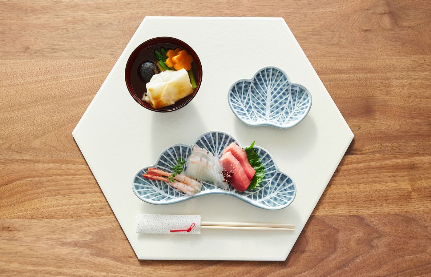 品のある光沢の六角トレーに松葉模様が映える有田焼プレートを合わせました。盛り付けるだけで、華やかな印象に仕上がります。