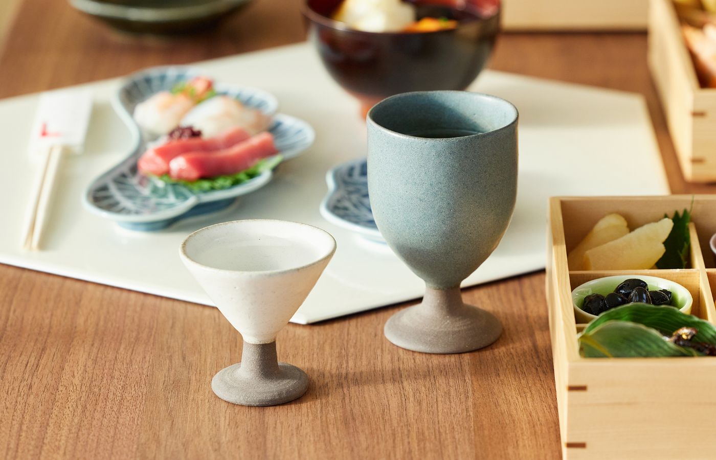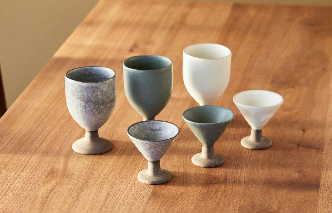 美濃焼のアクタスオリジナルのワインカップとシェリーカップ。和の食卓の品格を高める、高台のあるデザインが魅力です。洗練されたマットなトーンは、日常にも取り入れやすく、大人の時間を豊かに演出します。