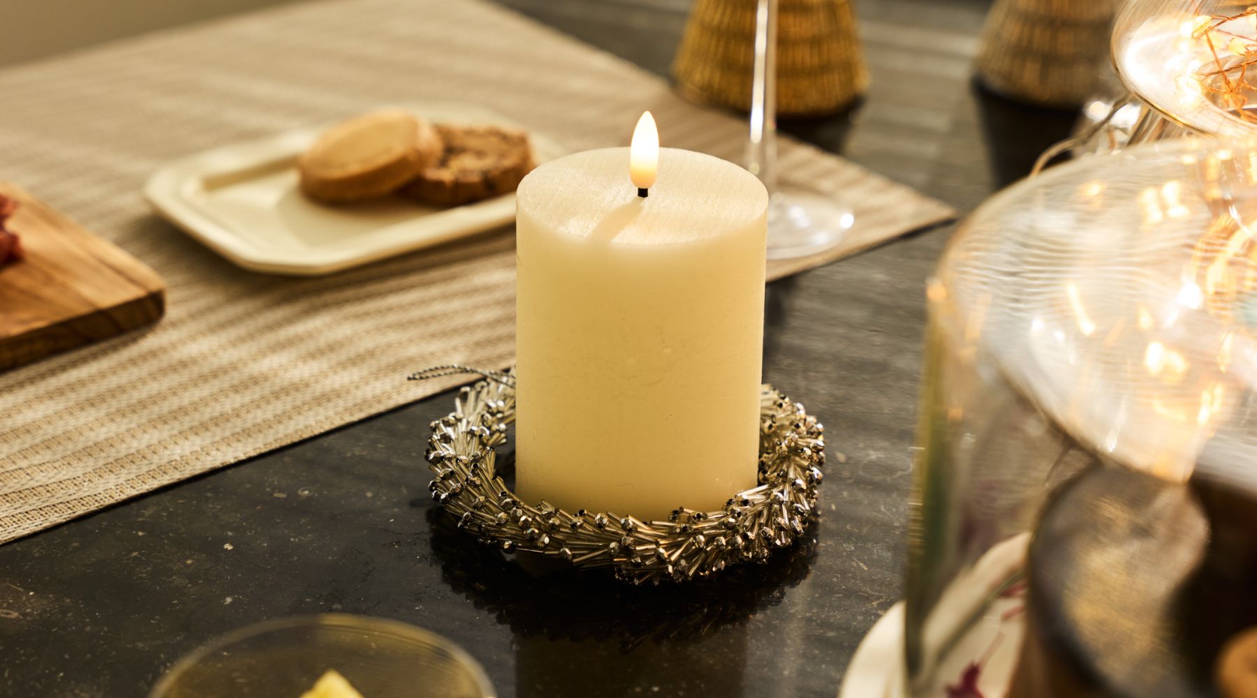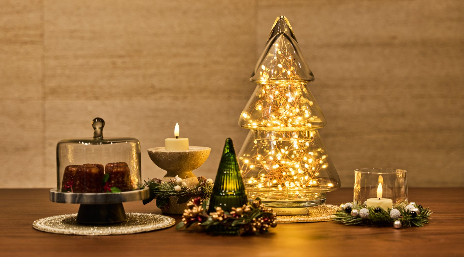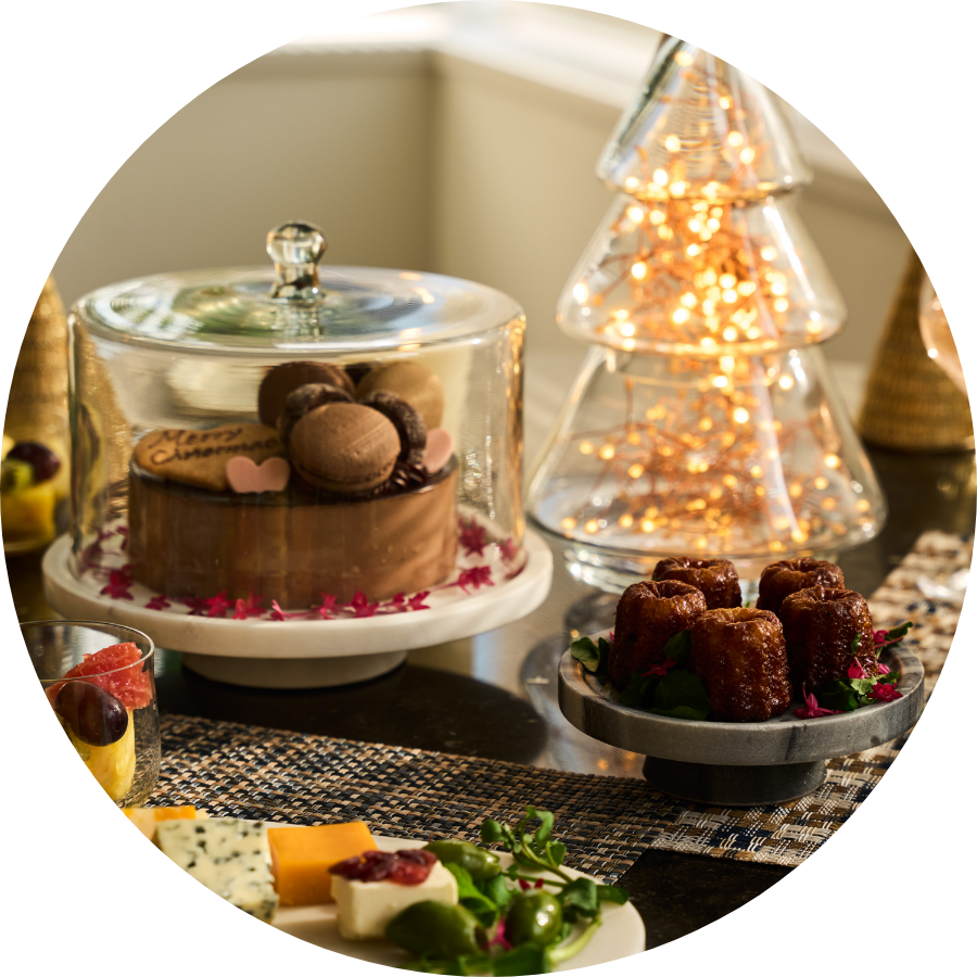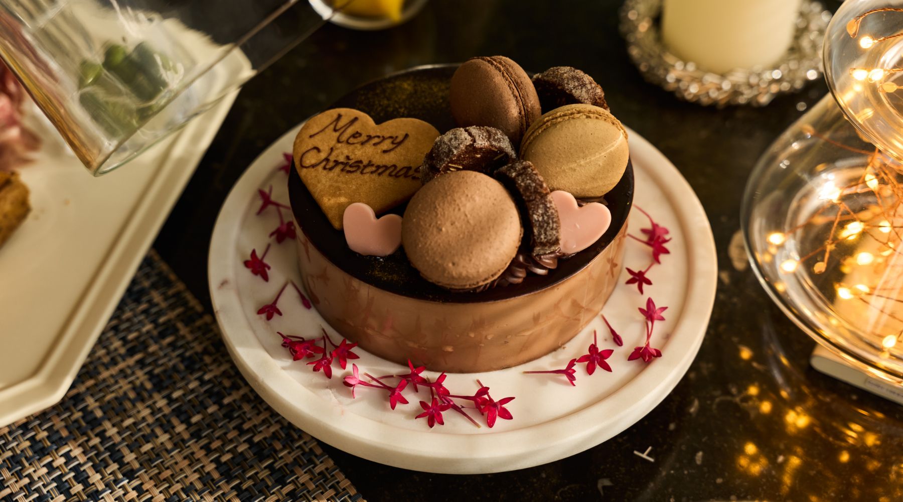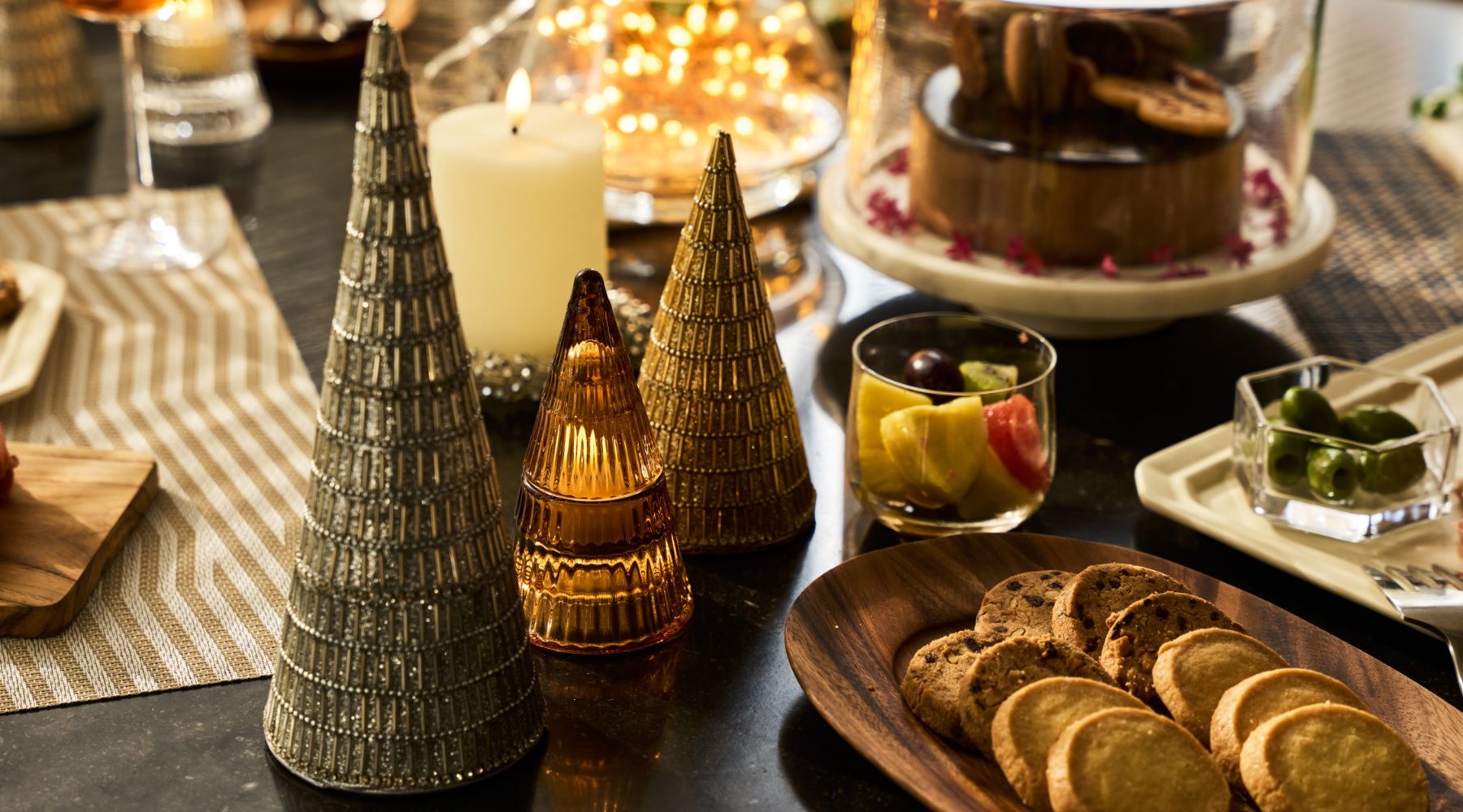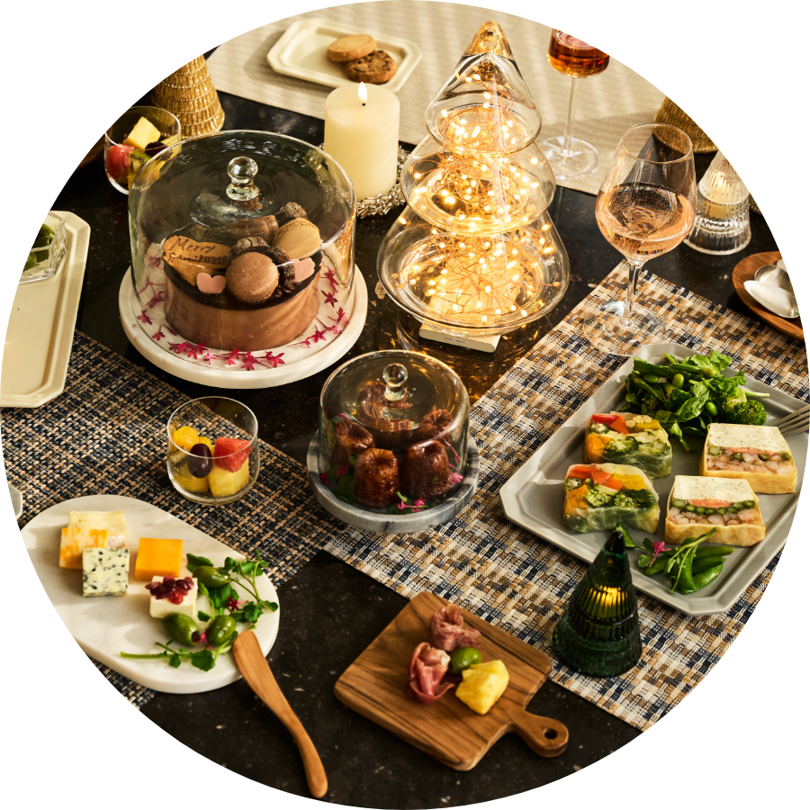 クリスマスの主役は、何と言ってもデコレーションケーキ。冷たさを保つ大理石のスタンドやパーティ仕様のフラットプレート、アカシア素材のテーブルウェア*も揃いました。